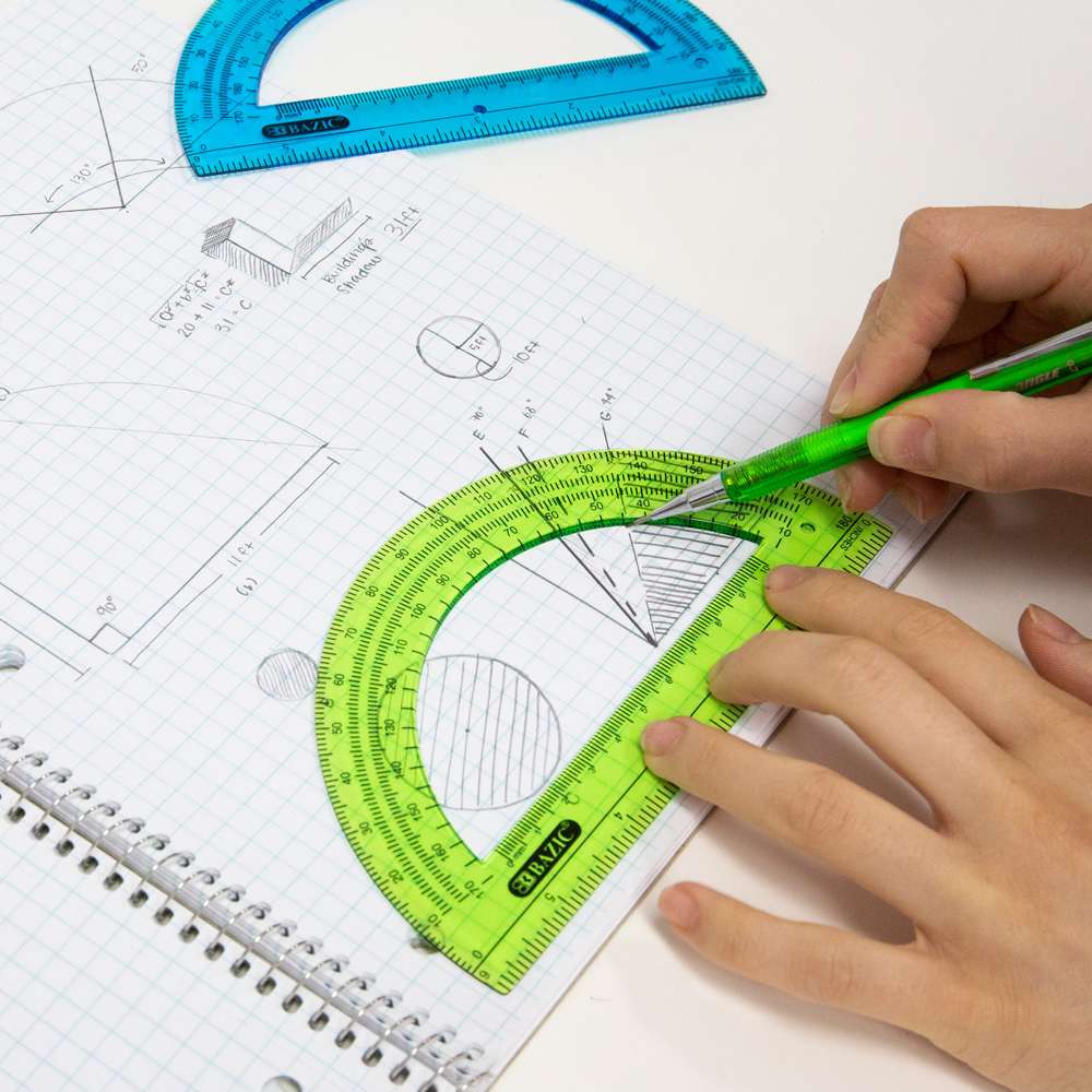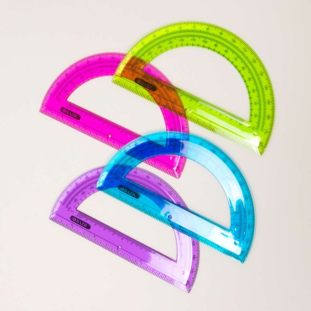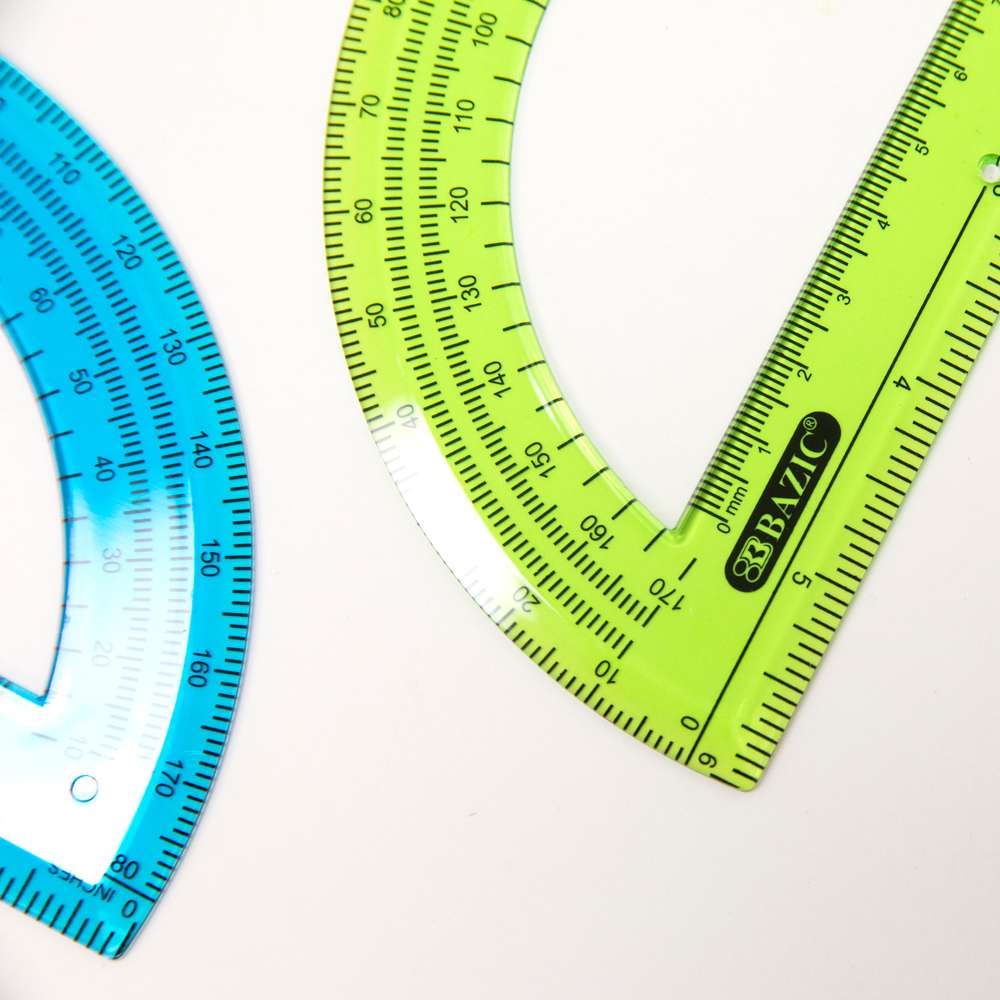 - VALUE SET. 180 degree protractor semicircular 6" protractors + Compass with pencil + Ruler 6" (15 cm) + Eraser + Sharpener. Clear color allow see the words, letters on page through the protractor