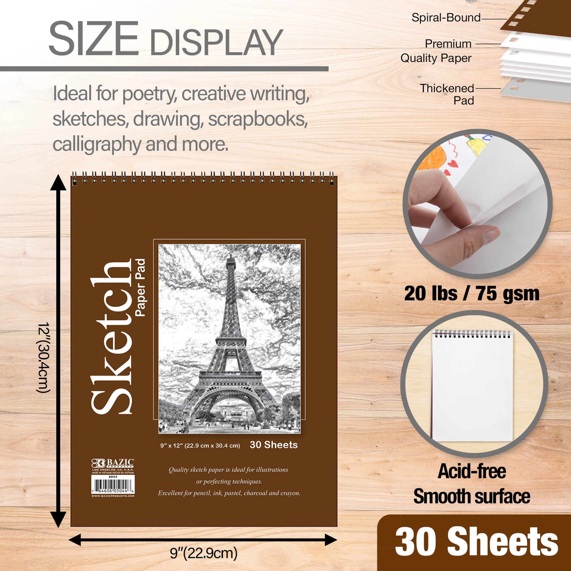 - ECONOMY DESIGN. 30 Sheet. Made of 20 lbs, 75 gsm paper. 9 x 12 inch provide plenty of room for poetry, creative writing, sketches, drawing, scrapbooks, calligraphy and more.