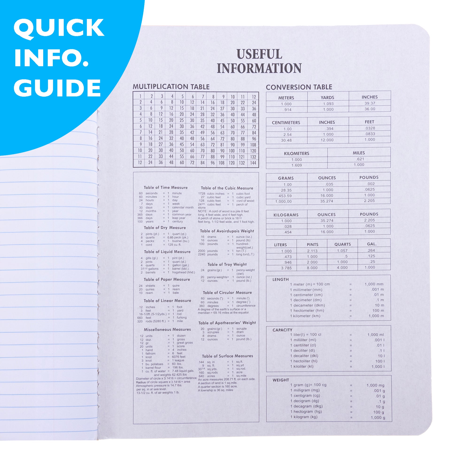 - SPECS. Inside front cover features a class schedule to keep you on track; inside back cover has multiplication tables, conversion tables and grammar rules for quick reference.