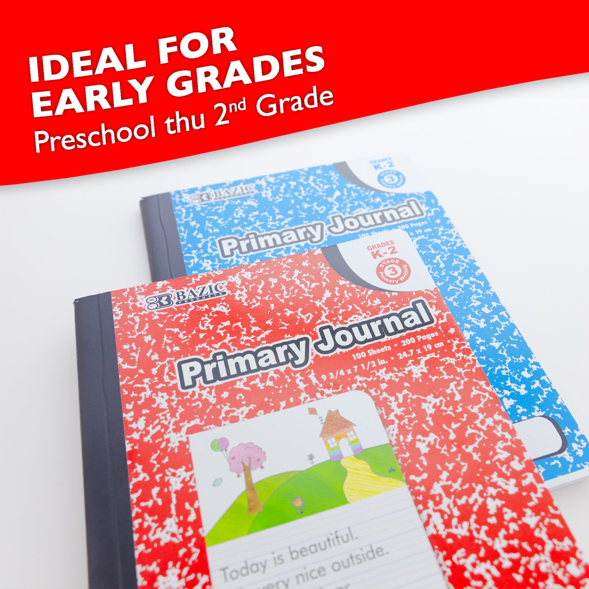 - PRIMARY JOURNAL. Primary journal books comes with 100 sheets of paper. Our kids composition books are recommended for Pre-School through 2nd Grades. Size: 9.75" x 7.5"inches.