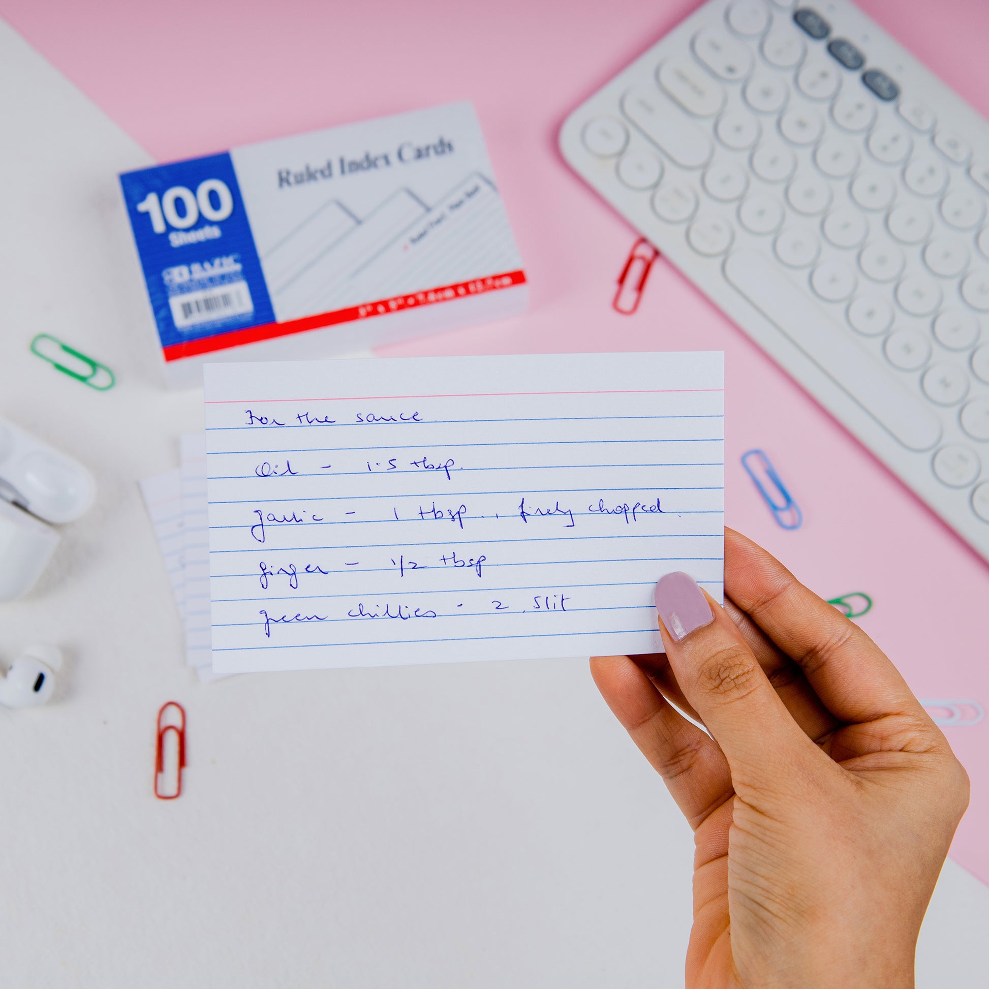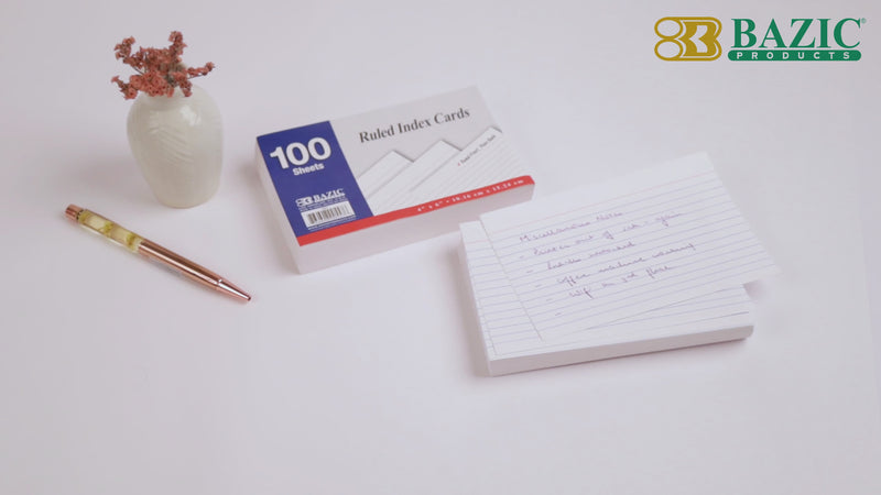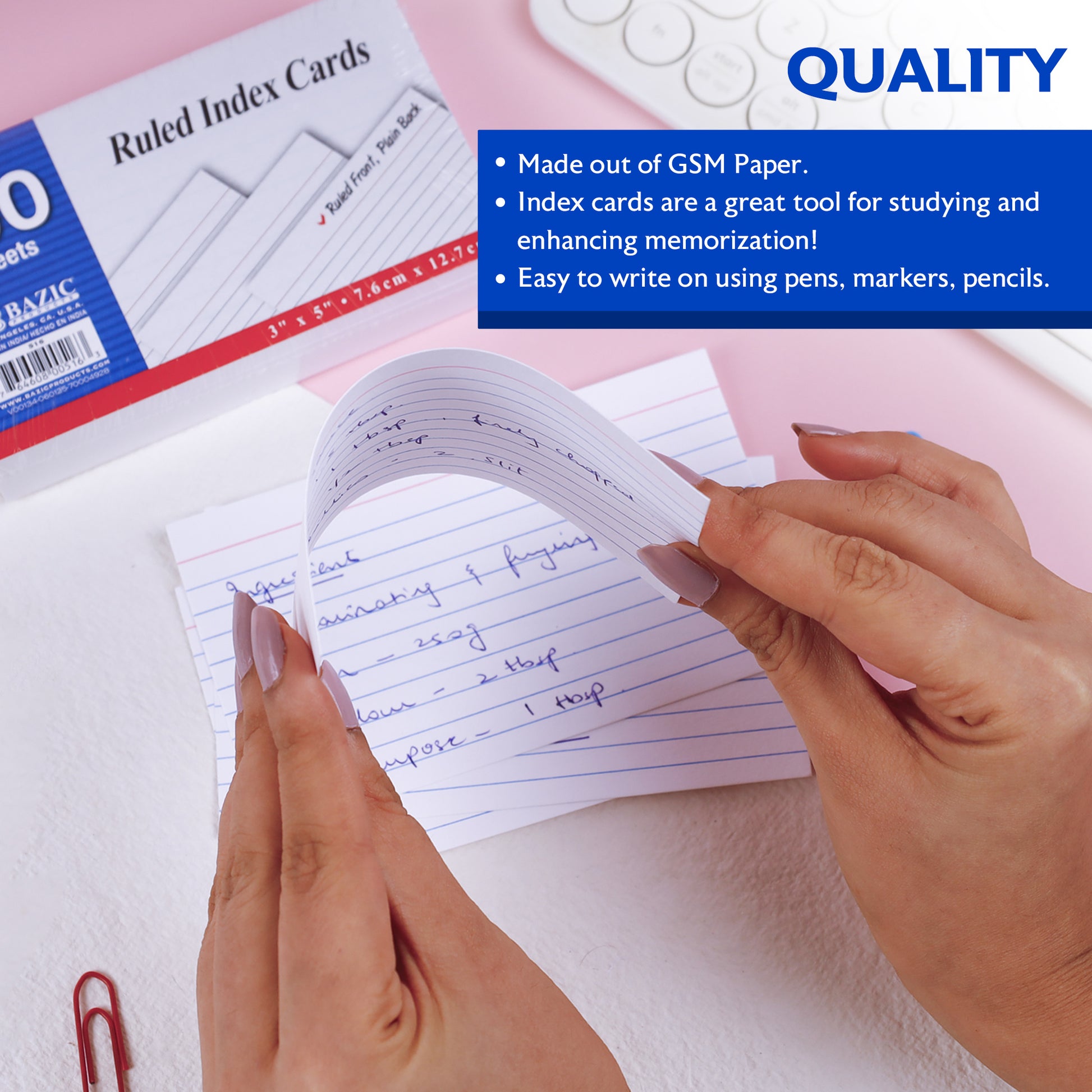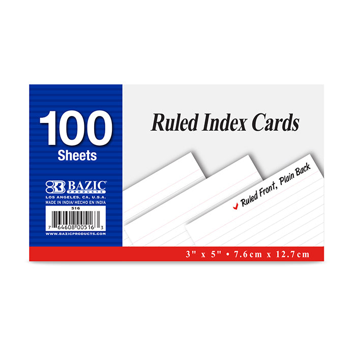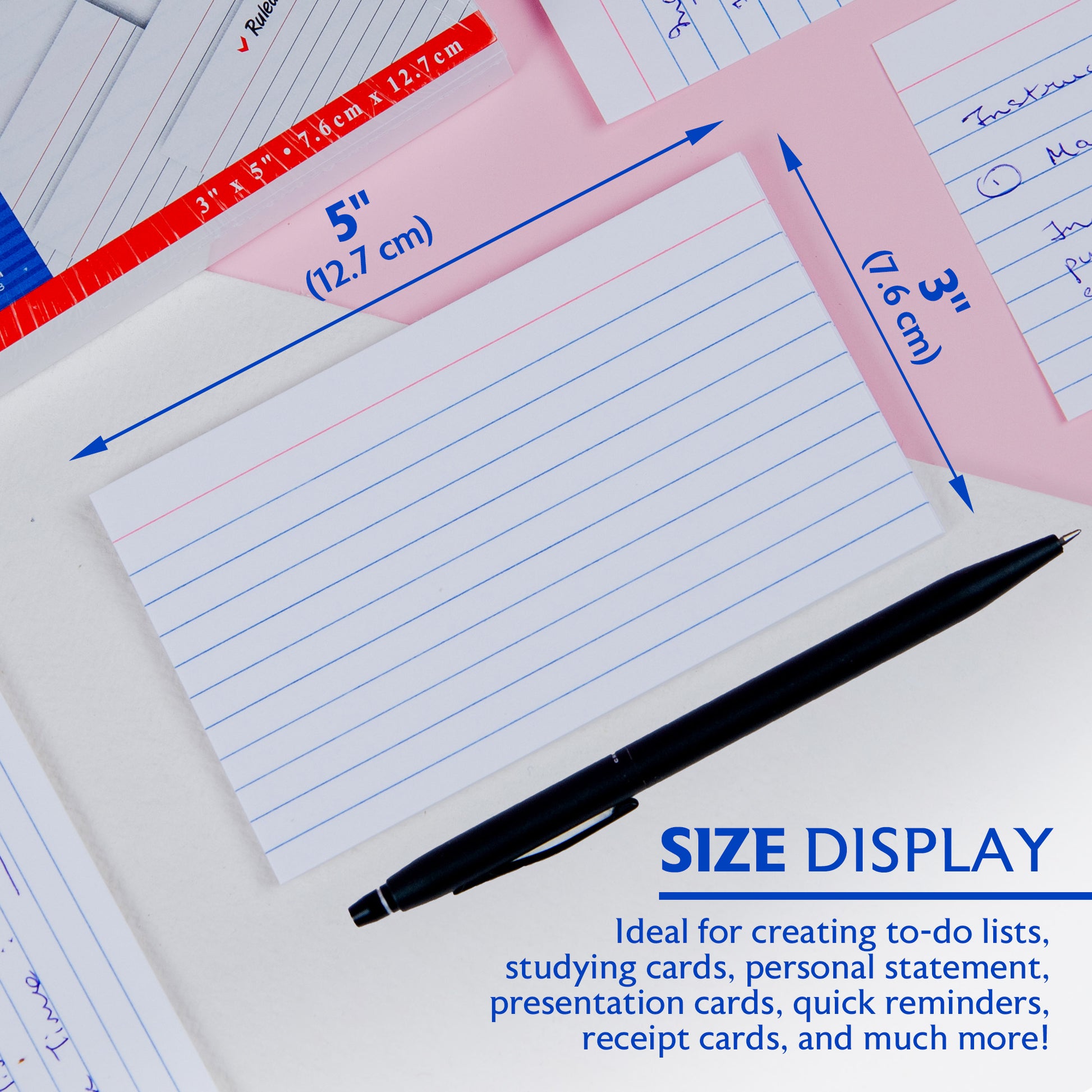 - PACKAGE INCLUDES. Ruled white index cards come with 100 sheets in total per pack. Index cards have a ruled front and plain back. Size: 3" x 5" inch - 7.6 cm x 12.7 cm