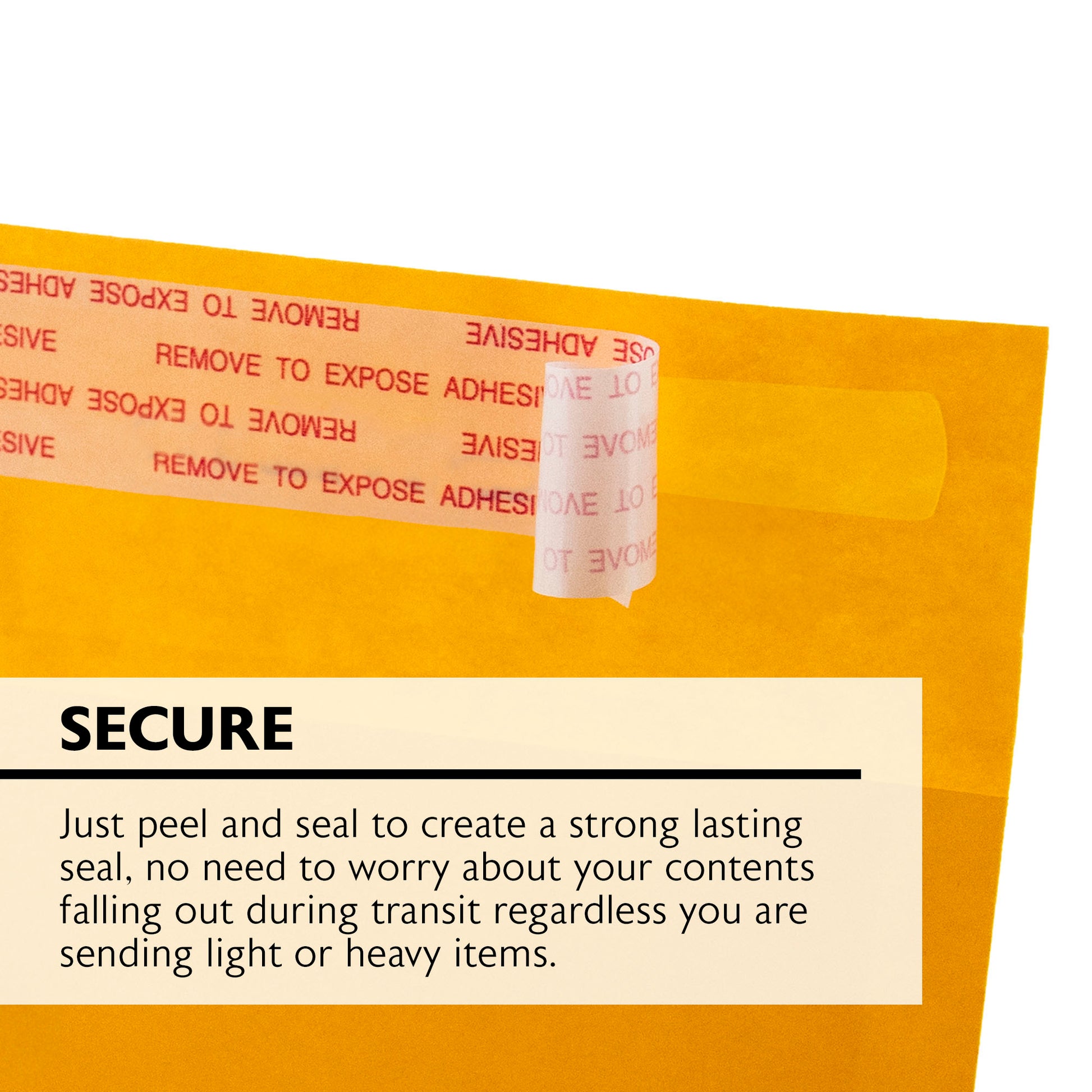 - SECURE. Just peel and seal to create a strong lasting seal, no need to worry about your contents falling out during transit regardless you are sending light or heavy items.