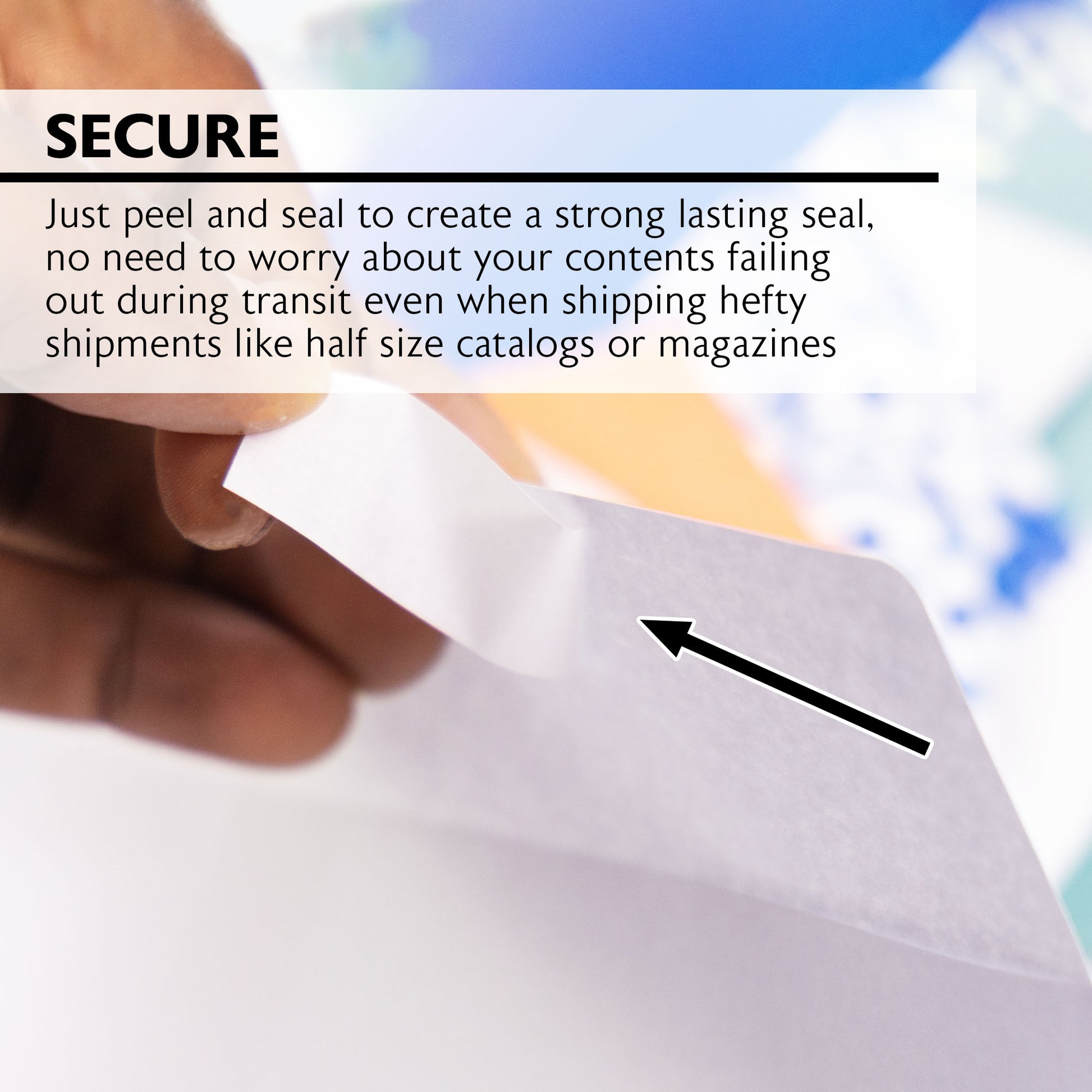 - SECURE. Just peel and seal to create a strong lasting seal, no need to worry about your contents failing out during transit even when shipping hefty shipments like half size catalogs or magazines.