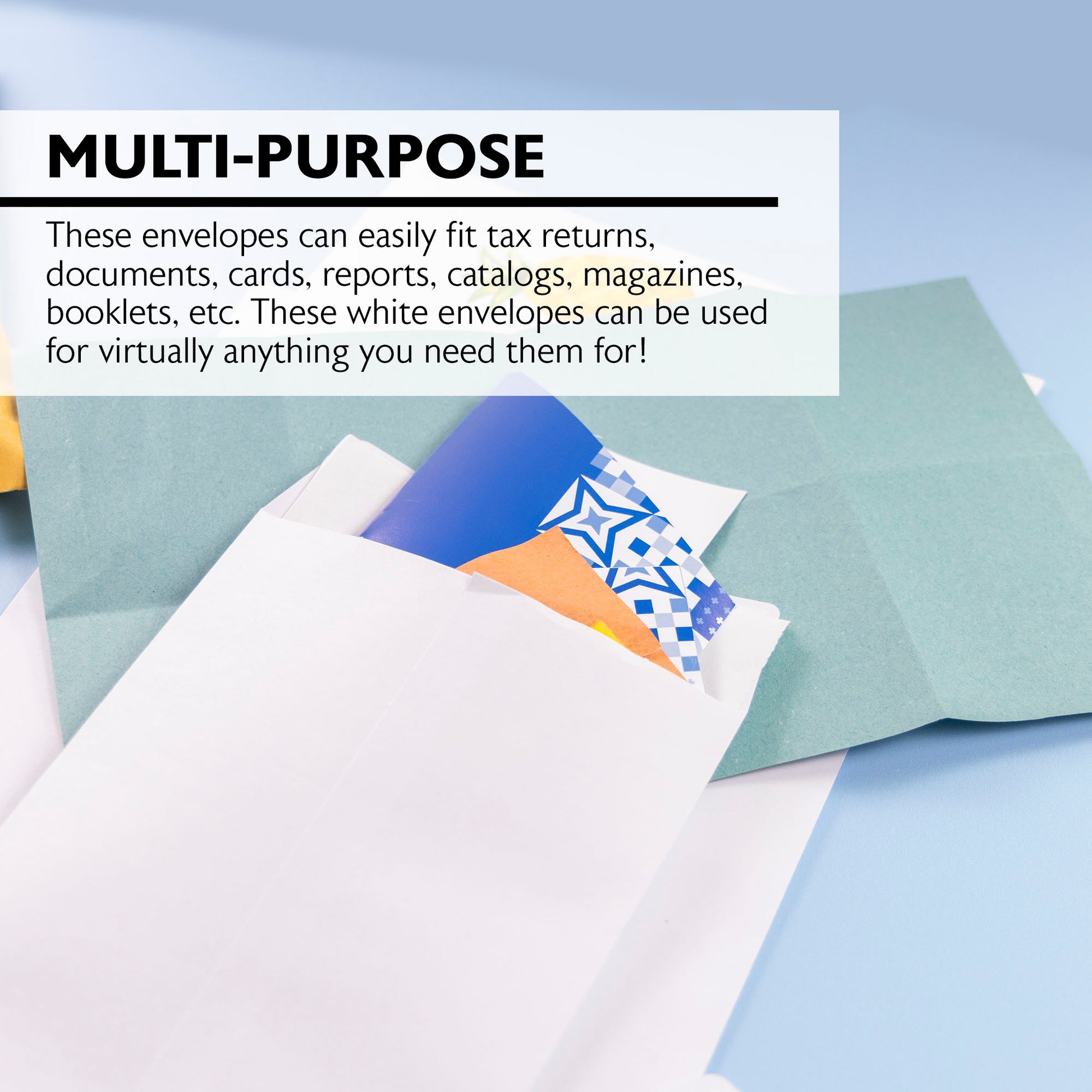 - MULTI-PURPOSE. These envelopes can easily fit tax returns, documents, cards, reports, catalogs, magazines, booklets, etc. These white envelopes can be used for virtually anything you need them for!