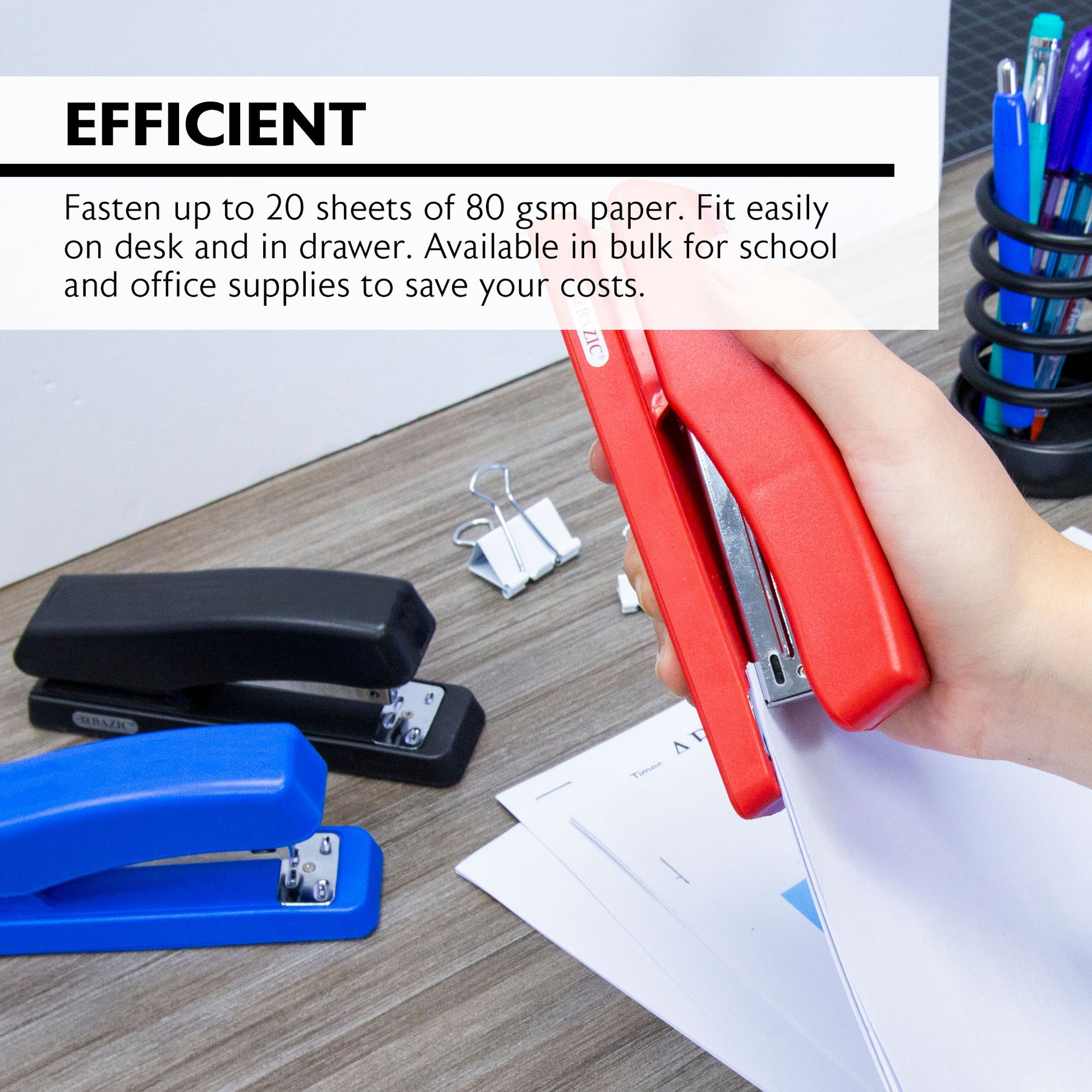 - EFFICIENT. Fasten up to 20 sheets of 80 gsm paper. Opens 180 degrees for tacking or crafting use. Fit easily on desk and in drawer. Available in bulk for school and office supplies to save your costs.