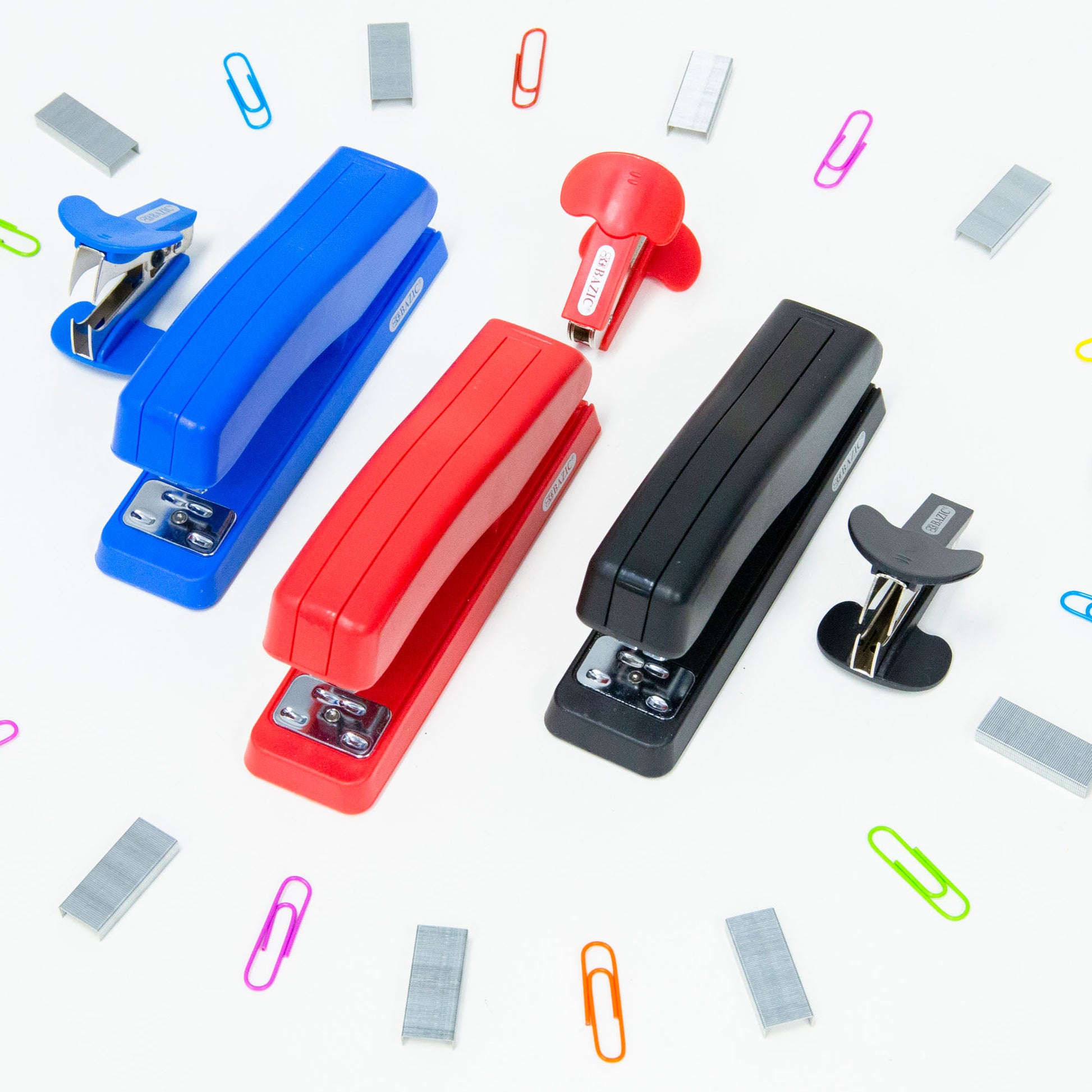 - BRIGHT COLOR. Available in 3 colors is suitable for school, home, office. Keep finger away from where staples are coming out. Made of premium plastic and sturdy metal.