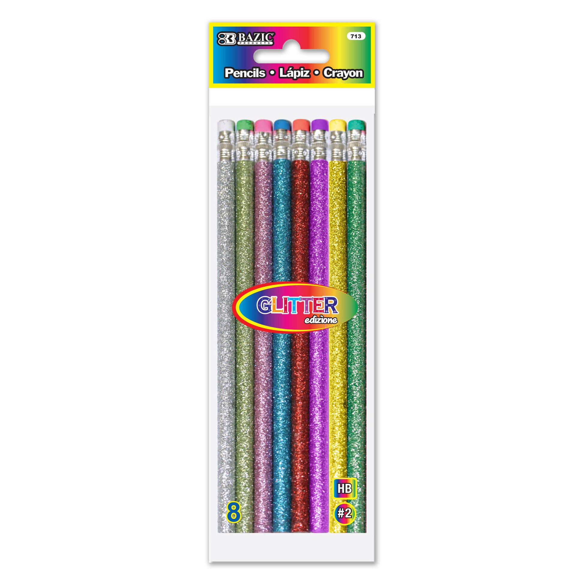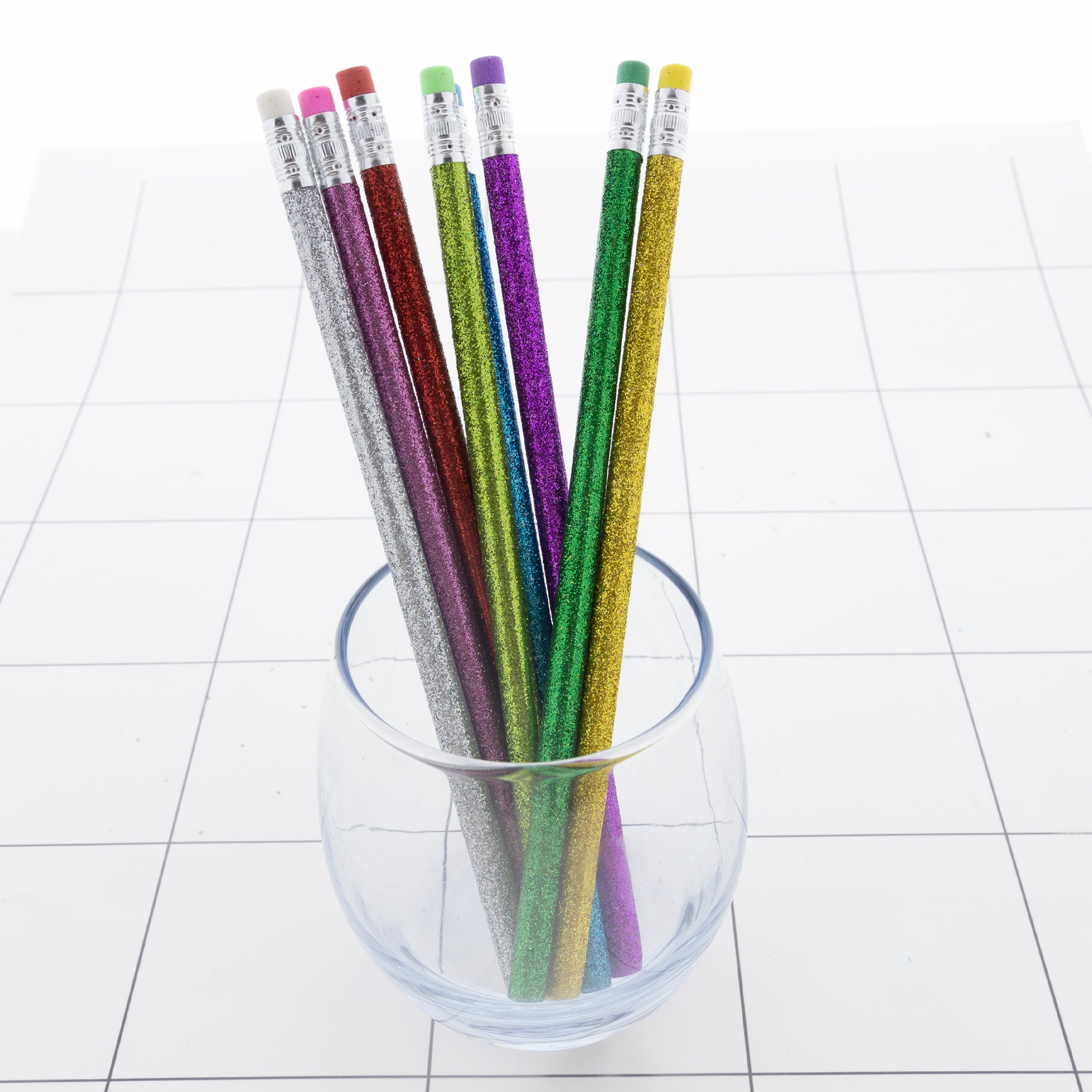 - GLITTER WOOD PENCIL W/ ERASER. Each pack comes with 8 wooden pencils. Features glitter barrel for fun writing experience. Easy to erase and easy to sharpen with any quality sharpener.