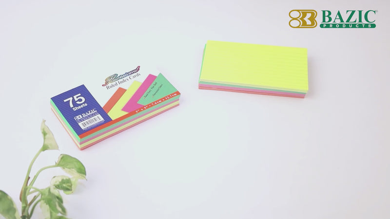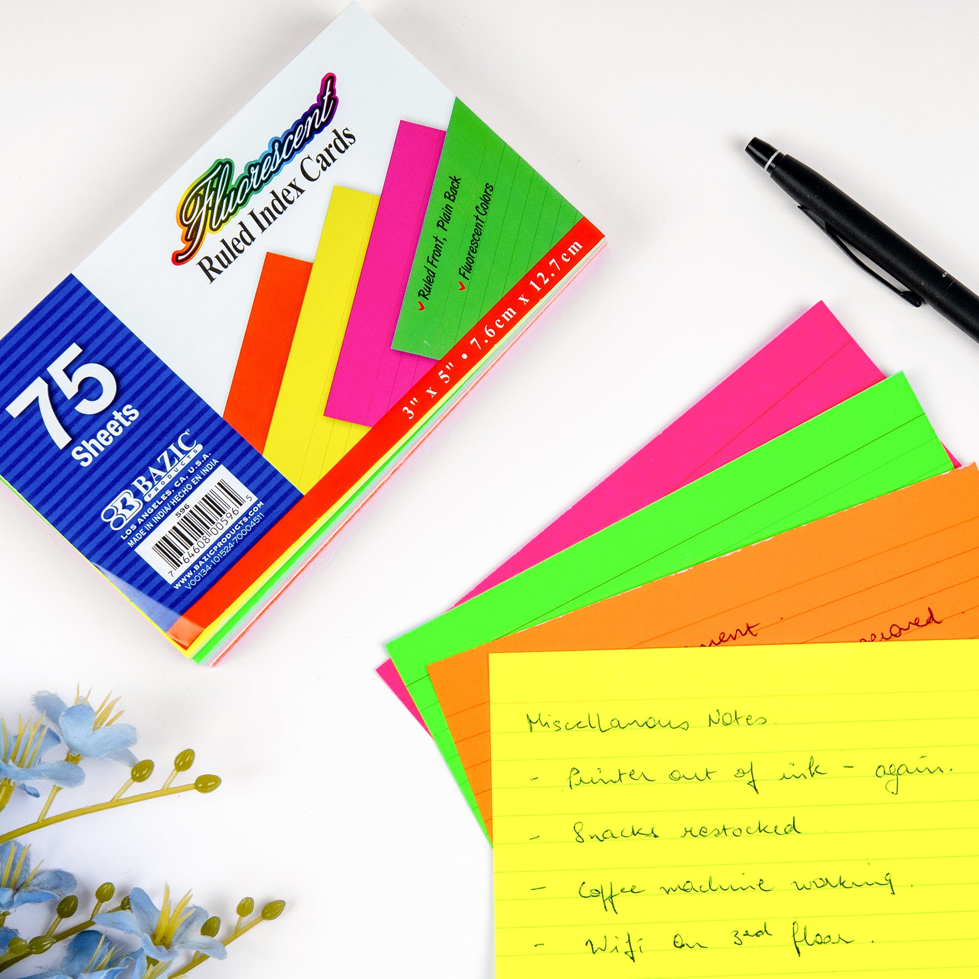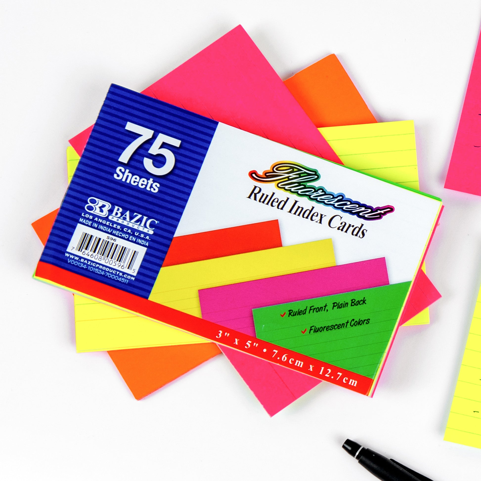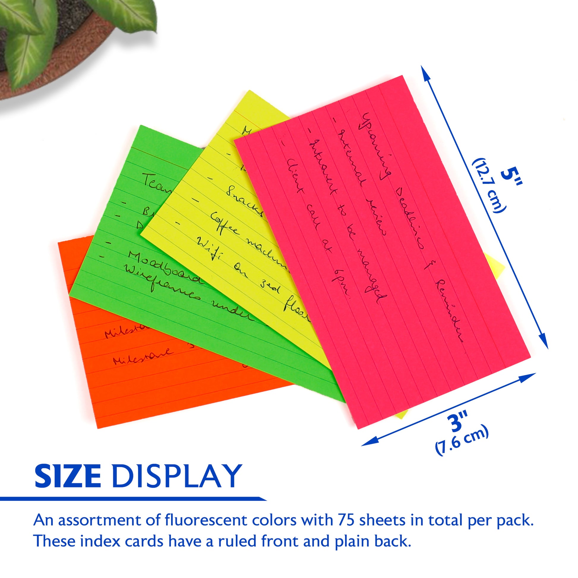 - PACKAGE INCLUDES. Ruled index cards come in an assortment of fluorescent colors with 75sheets in total per pack. Index cards have a ruled front and plain back.Size: 3"x5"inch- 7.6cm x 12.7cm