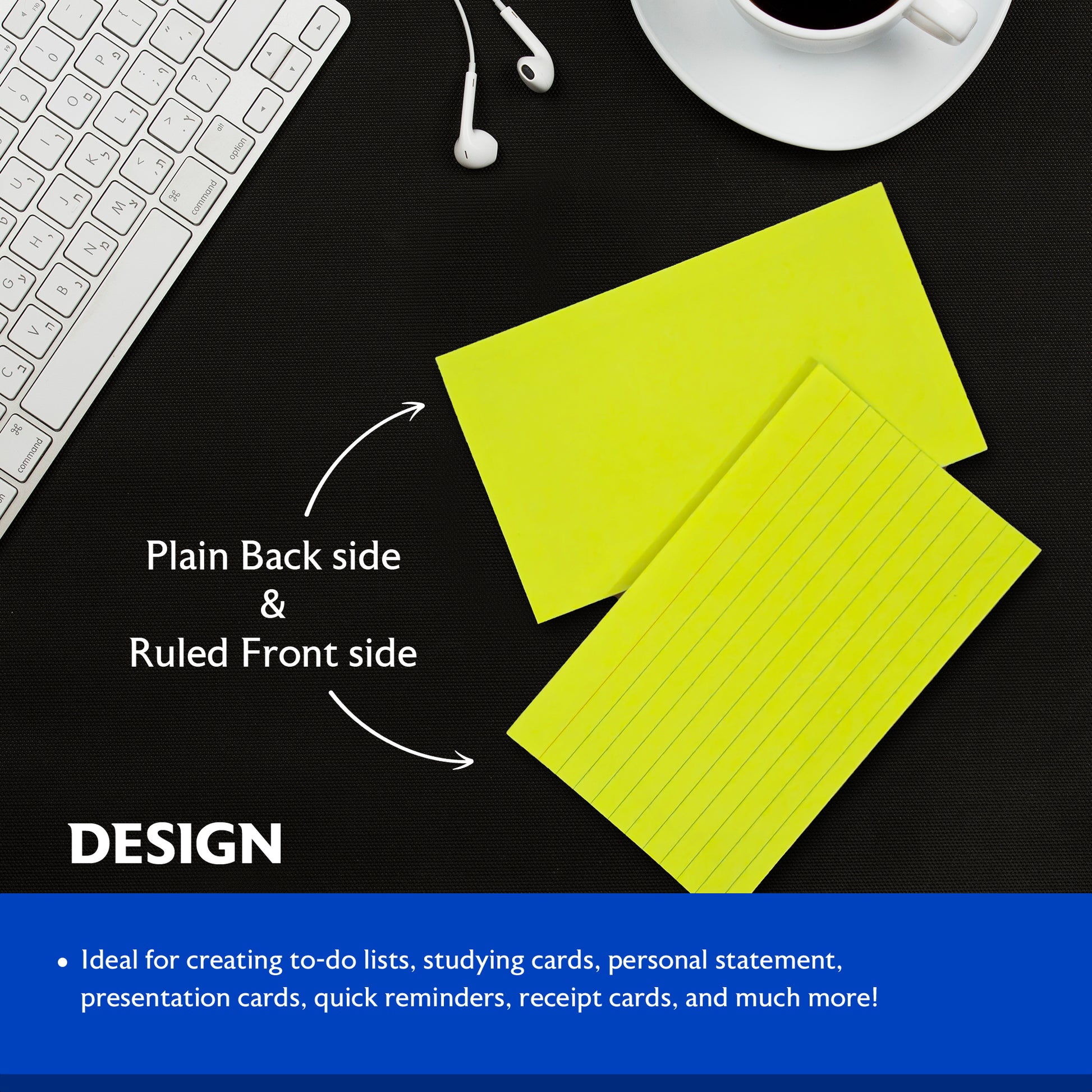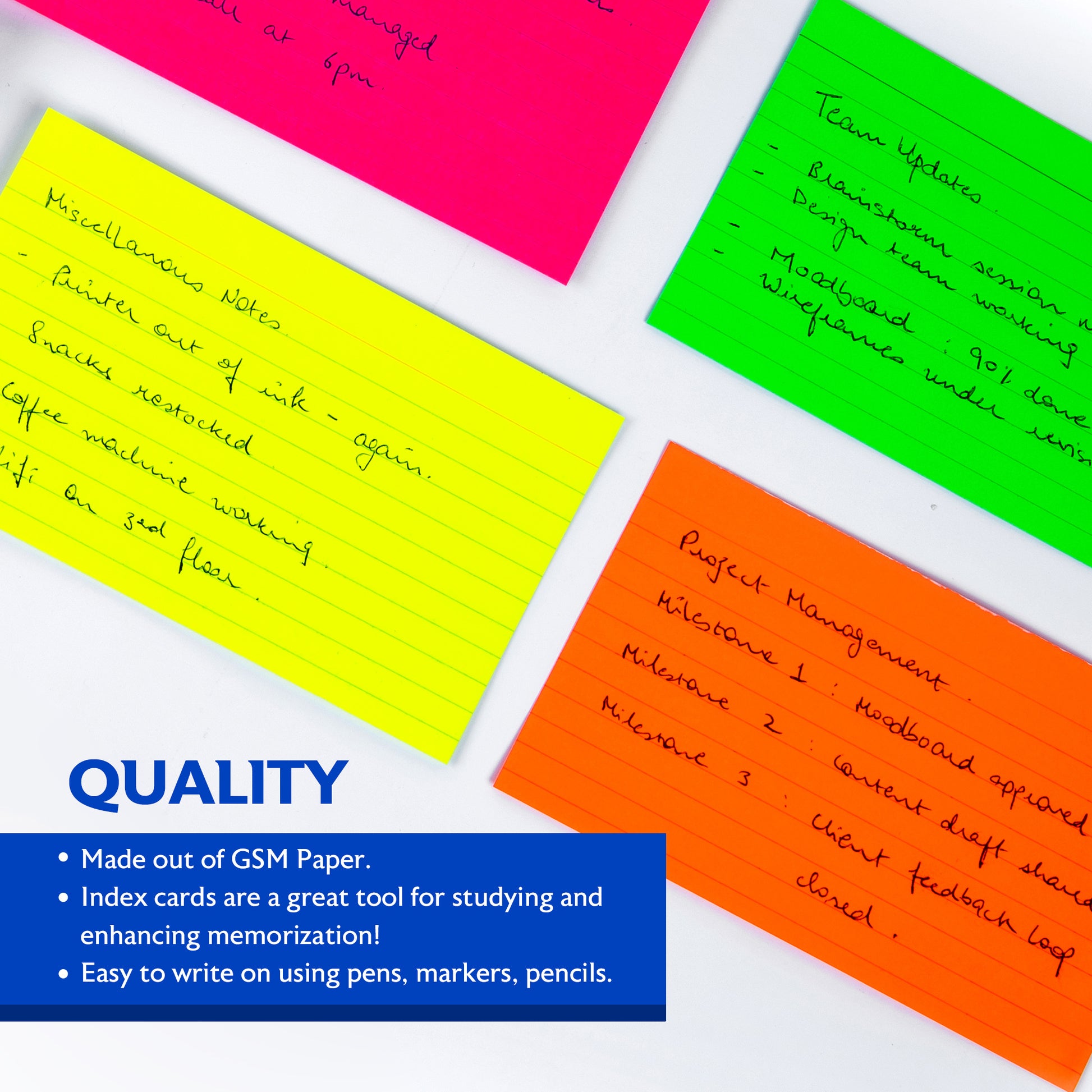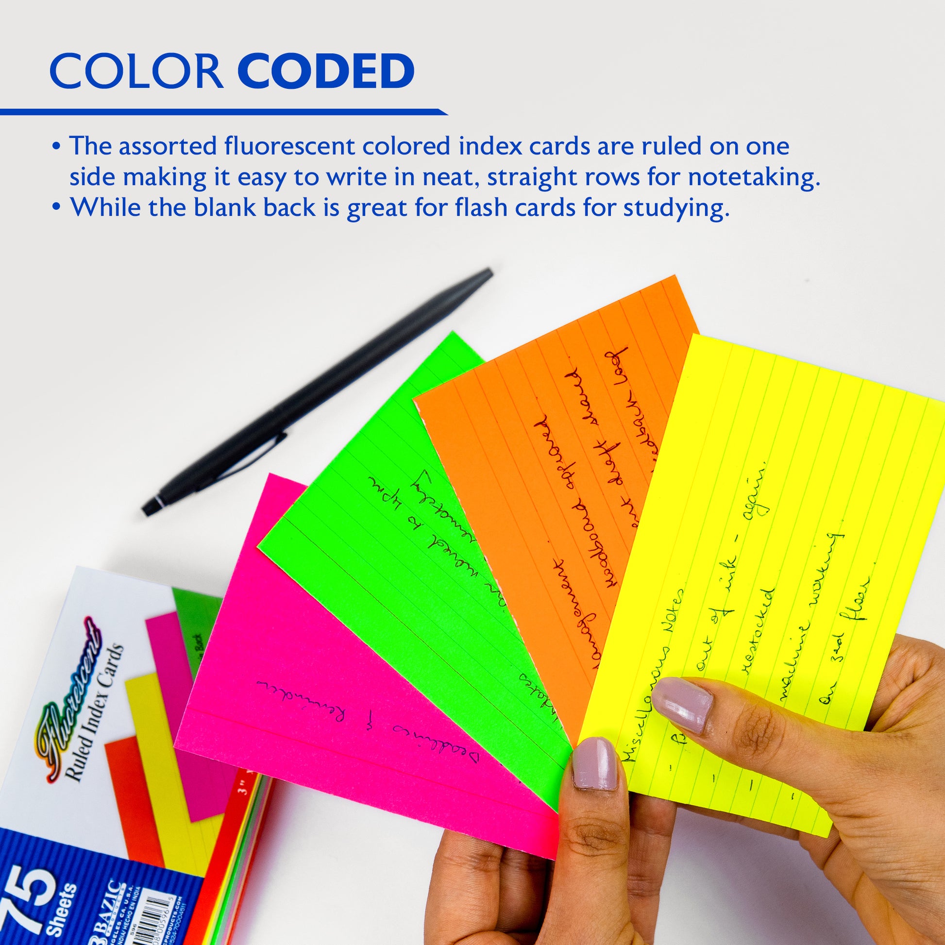 - DESIGN. The assorted fluorescent colored index cards are ruled on one side making it easy to write in neat, straight rows for note-taking. While the blank back is great for flash cards for studying.