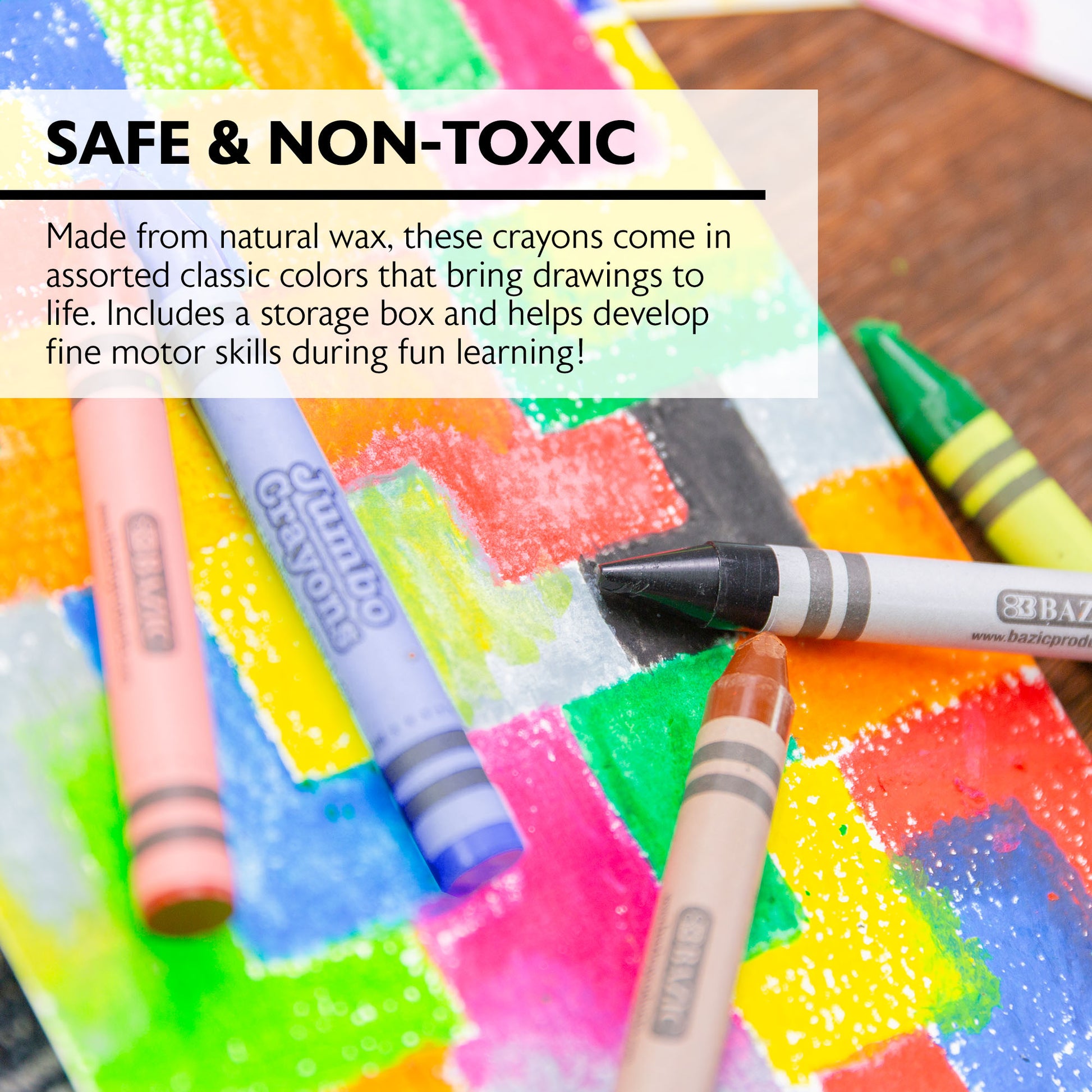 - SAFE & NON TOXIC. Made from natural wax, these crayons come in assorted classic colors that bring drawings to life. Includes a storage box and helps develop fine motor skills during fun learning!