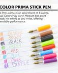 - 8 COLOR PRIMA STICK PEN. Stick Pens come in an assortment of 8 colors; Actual Colors May Vary! Medium ball point spreads ink evenly as you write, offering dependable performance.