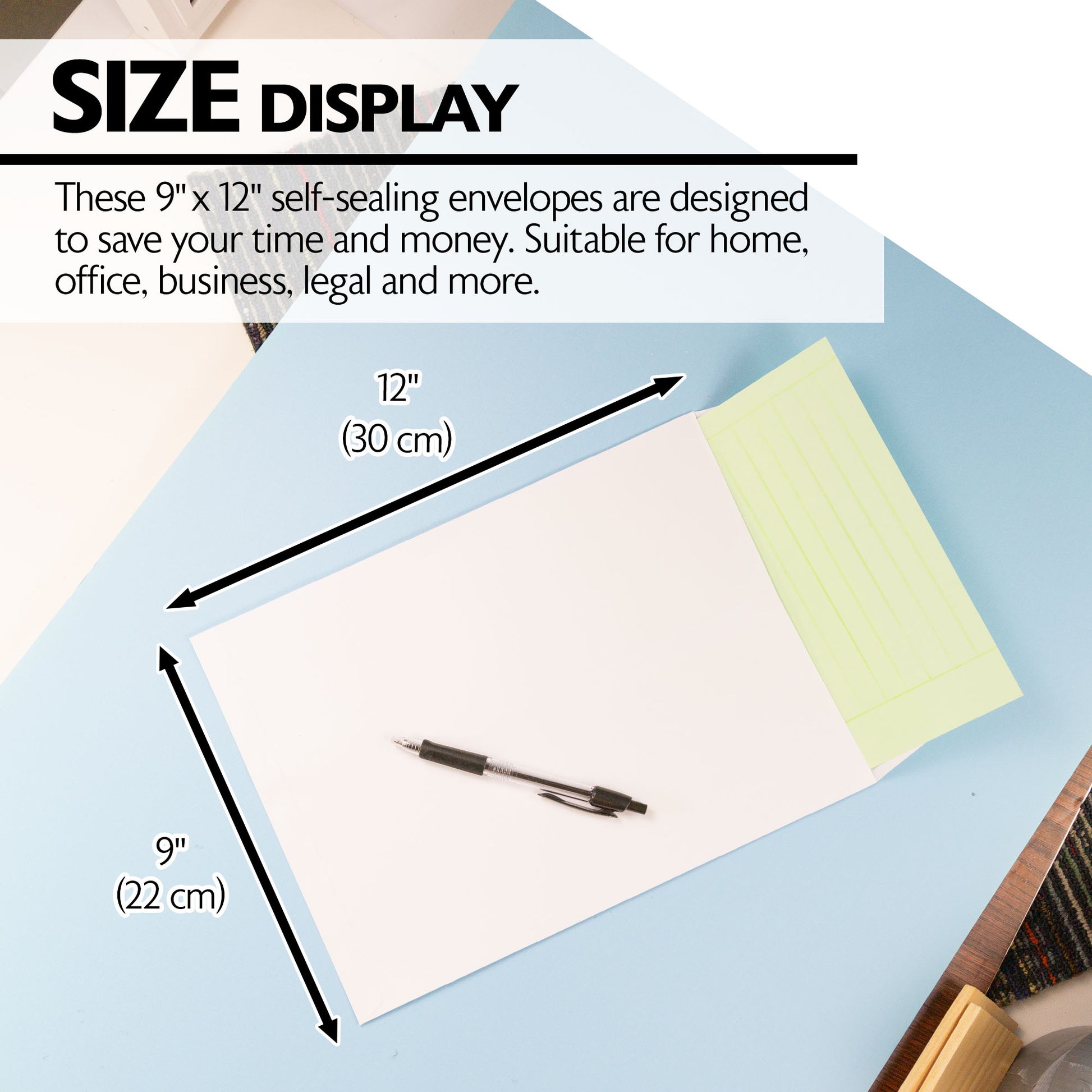 - CATALOG ENVELOPES. These 9" x 12" self-sealing envelopes are designed to save your time and money. No licking and long shelf life (free for dust). Suitable for home, office, business, legal and more.