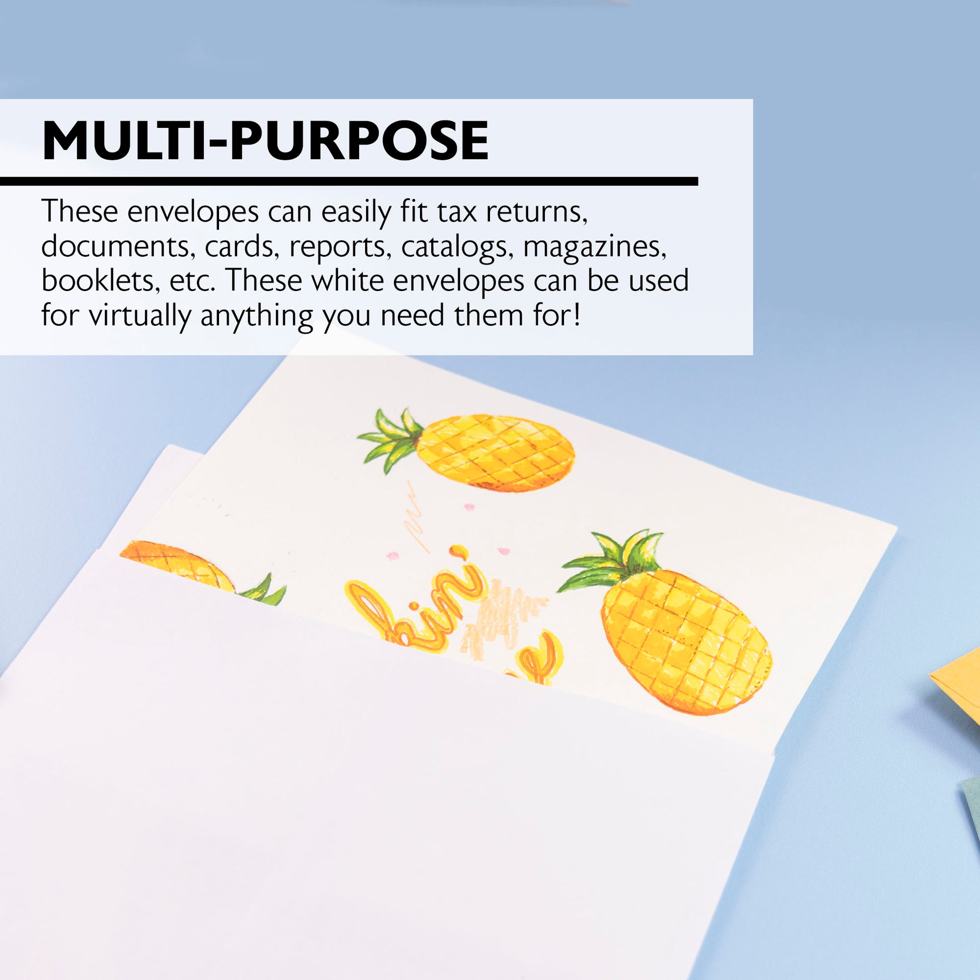 - MULTI-PURPOSE. These envelopes can easily fit tax returns, documents, cards, reports, catalogs, magazines, booklets, etc. These white envelopes can be used for virtually anything you need them for!