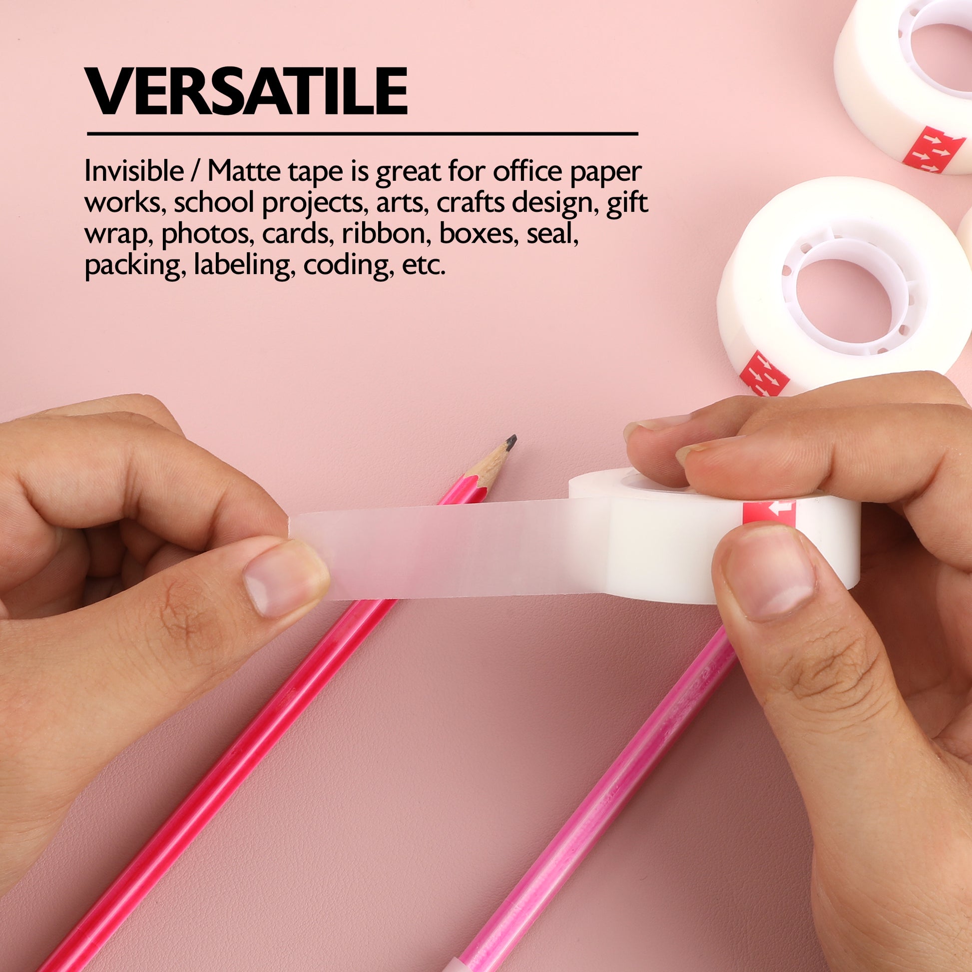 - VERSATILE. Invisible / Matte tape is great for office paper works, school projects, arts, crafts design, gift wrap, photos, cards, ribbon, boxes, seal, packing, labeling, coding, etc.