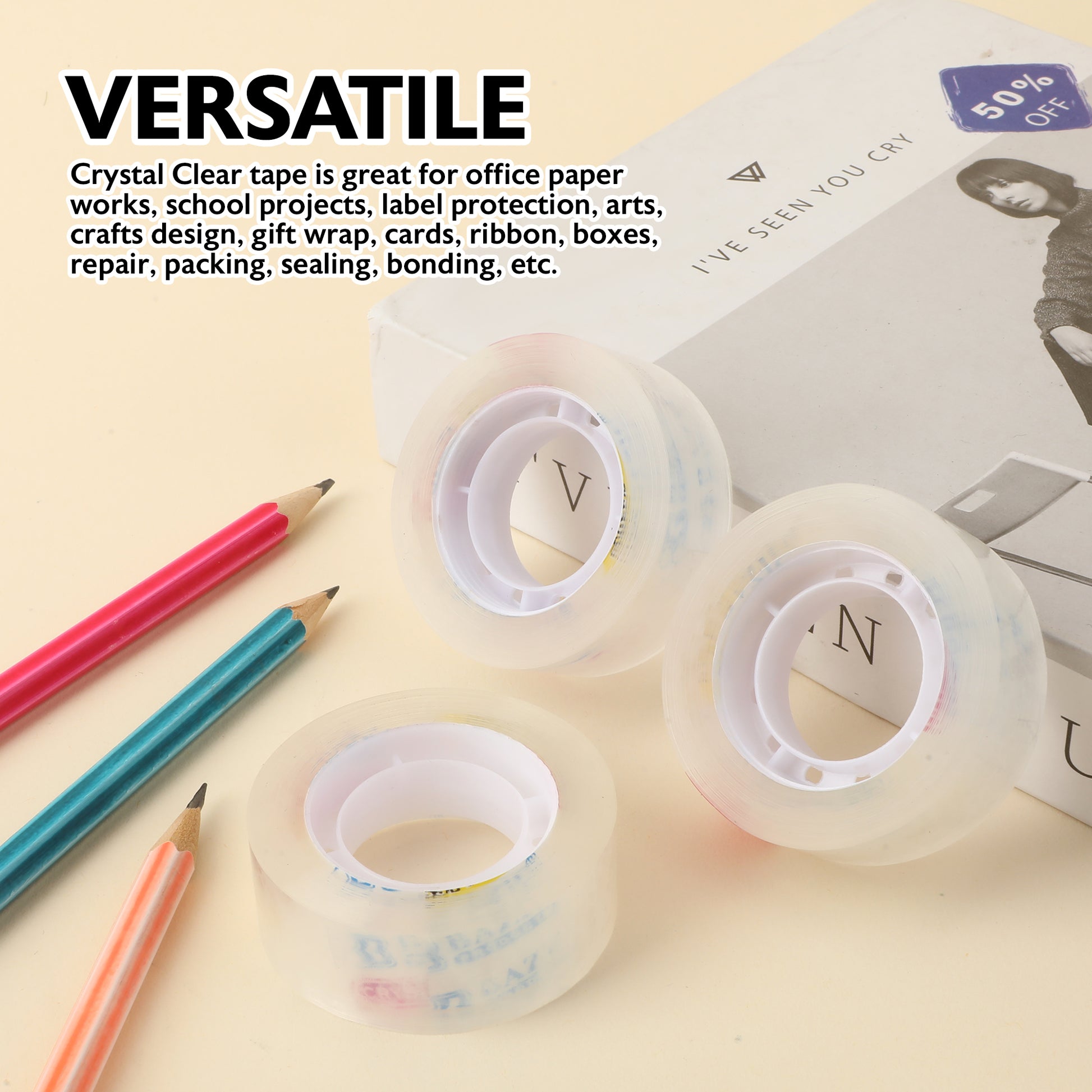 - VERSATILE. Crystal Clear tape is great for office paper works, school projects, label protection, arts, crafts design, gift wrap, cards, ribbon, boxes, repair, packing, sealing, bonding, etc.