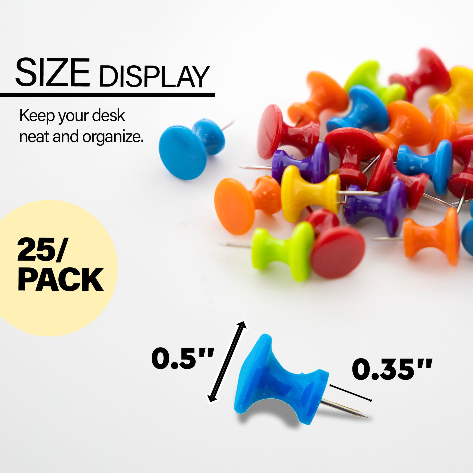 - JUMBOSize. 25-counts per pack. Measure 0.45" steel point. 0.5" diameter plastic head. Made of stainless steel metal ensure sharp, durable, and long lasting use. Keep your desk neat and organize.
