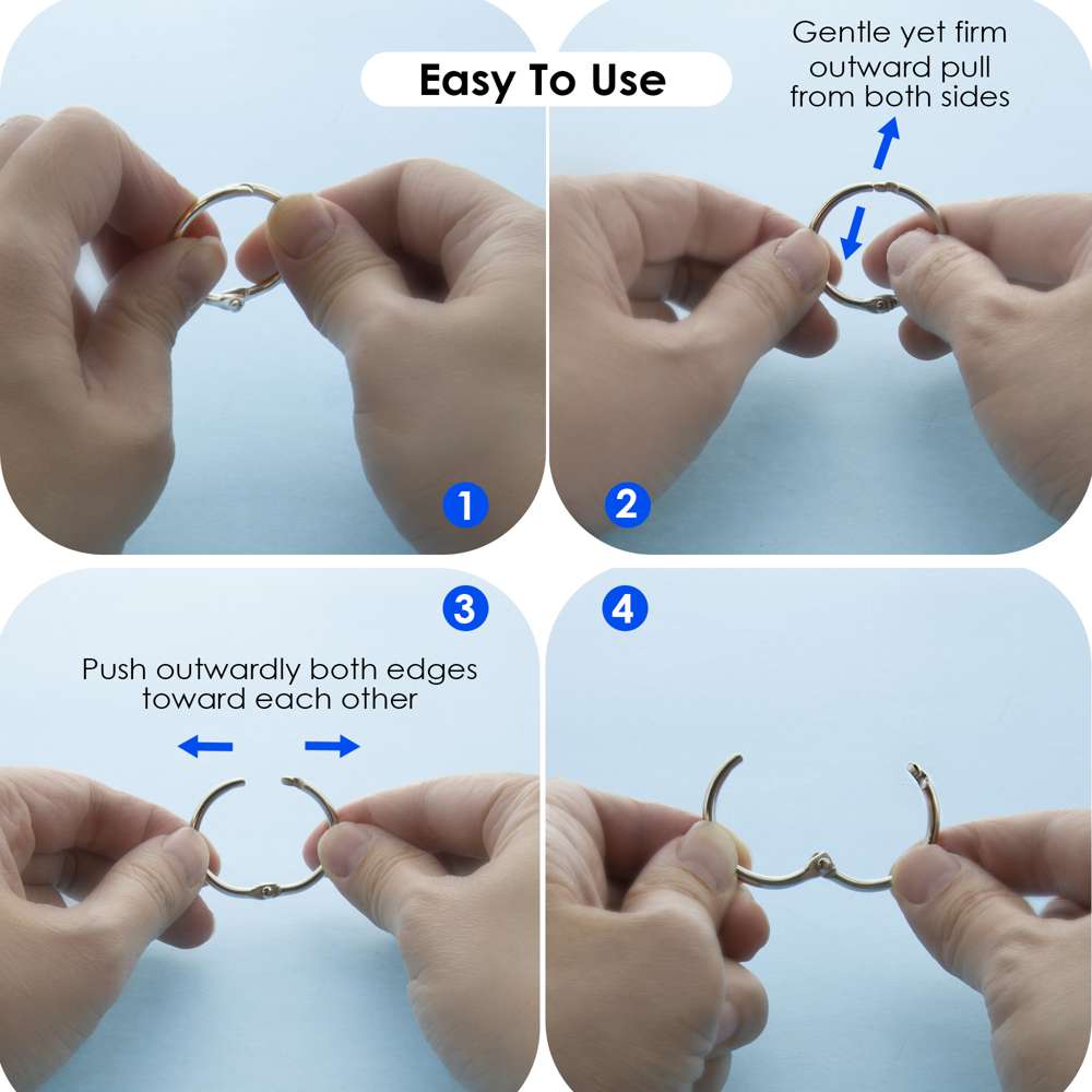 - SECURE. The latch on the book rings open and close easily and lock for extra security. It wont bend or break off. This is especially important if you plan to use these rings to hold your keys.