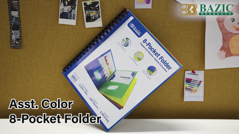 - FILE ORGANIZER. 8 pocket portfolios come come in assorted colors. An extremely useful product for presentations, organizing or arranging papers, files or other similar items.