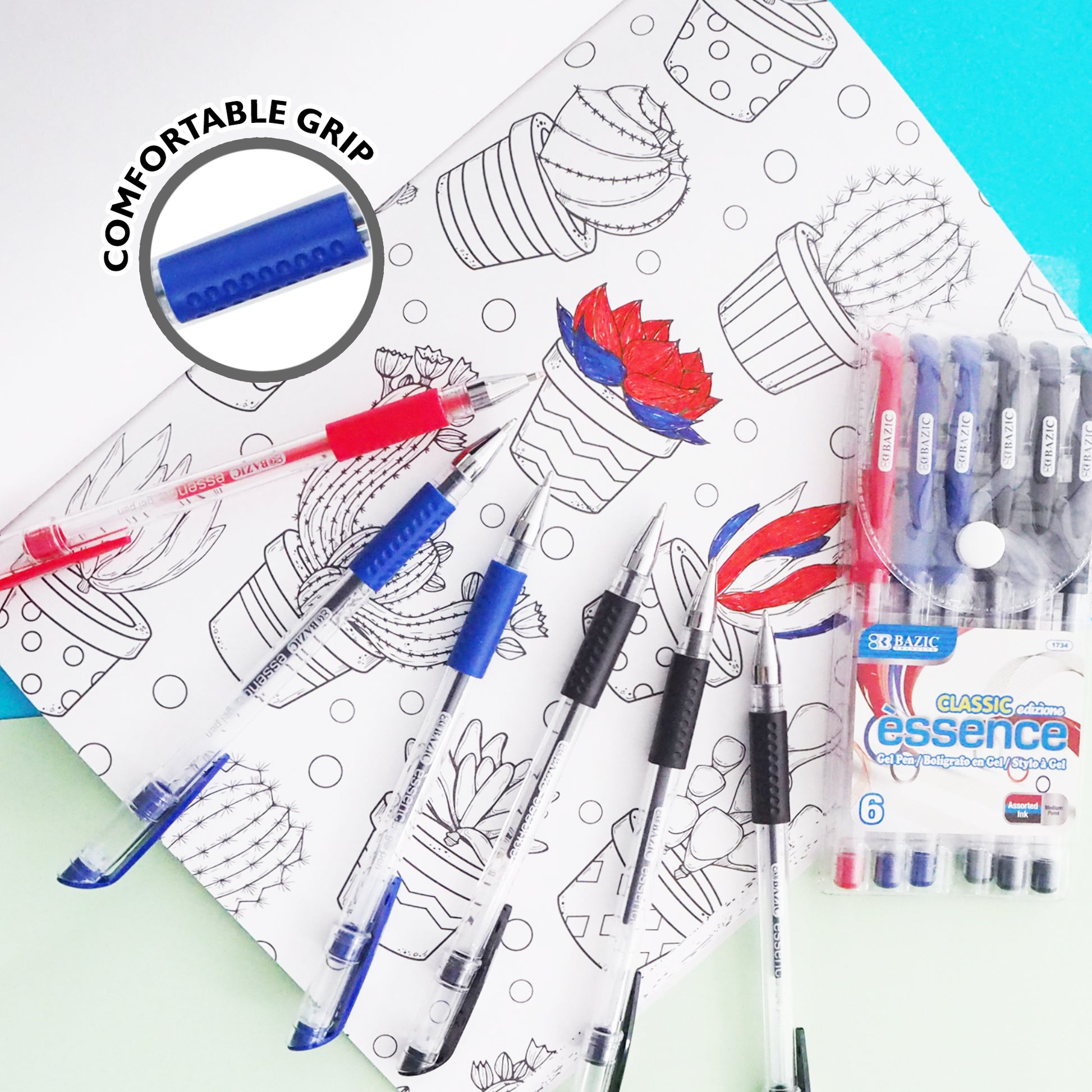 - ESSENCE ASSORTED GEL PENS. Each pack comes with a total of 6 gel pens with an extra comfortable grip and smooth gliding ink. Colors: Red, Blue and Black.