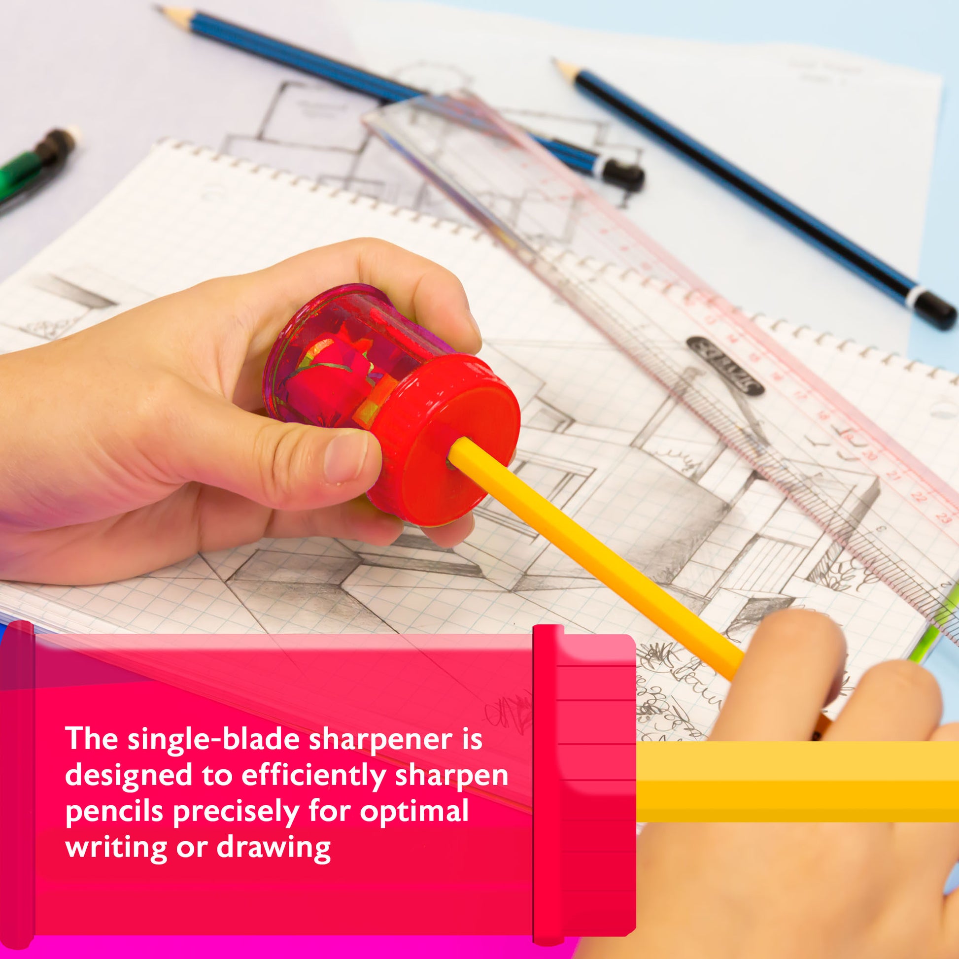 - EFFICIENT. The single-blade sharpener is designed to efficiently sharpen pencils precisely for optimal writing or drawing performance. Accommodates regular-sized pencils. Measure 1.5" x 1.5" x 1.75".