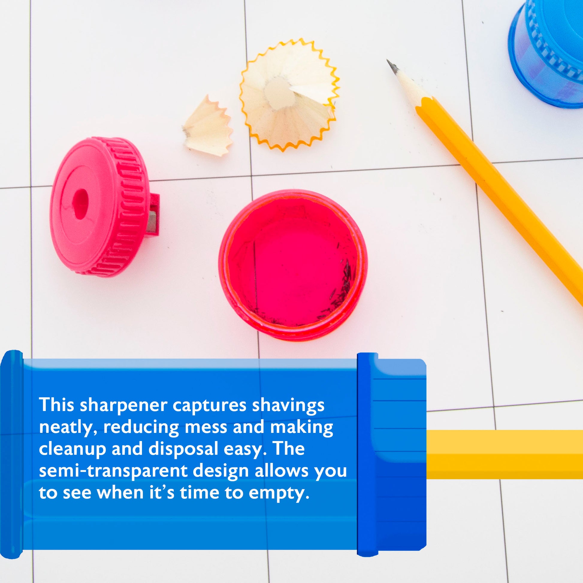 - ROUND RECEPTACLE. Featuring a round receptacle, this sharpener captures shavings neatly, reducing mess and making cleanup and disposal easy. The semi-transparent design allows you to see when it's time to empty.