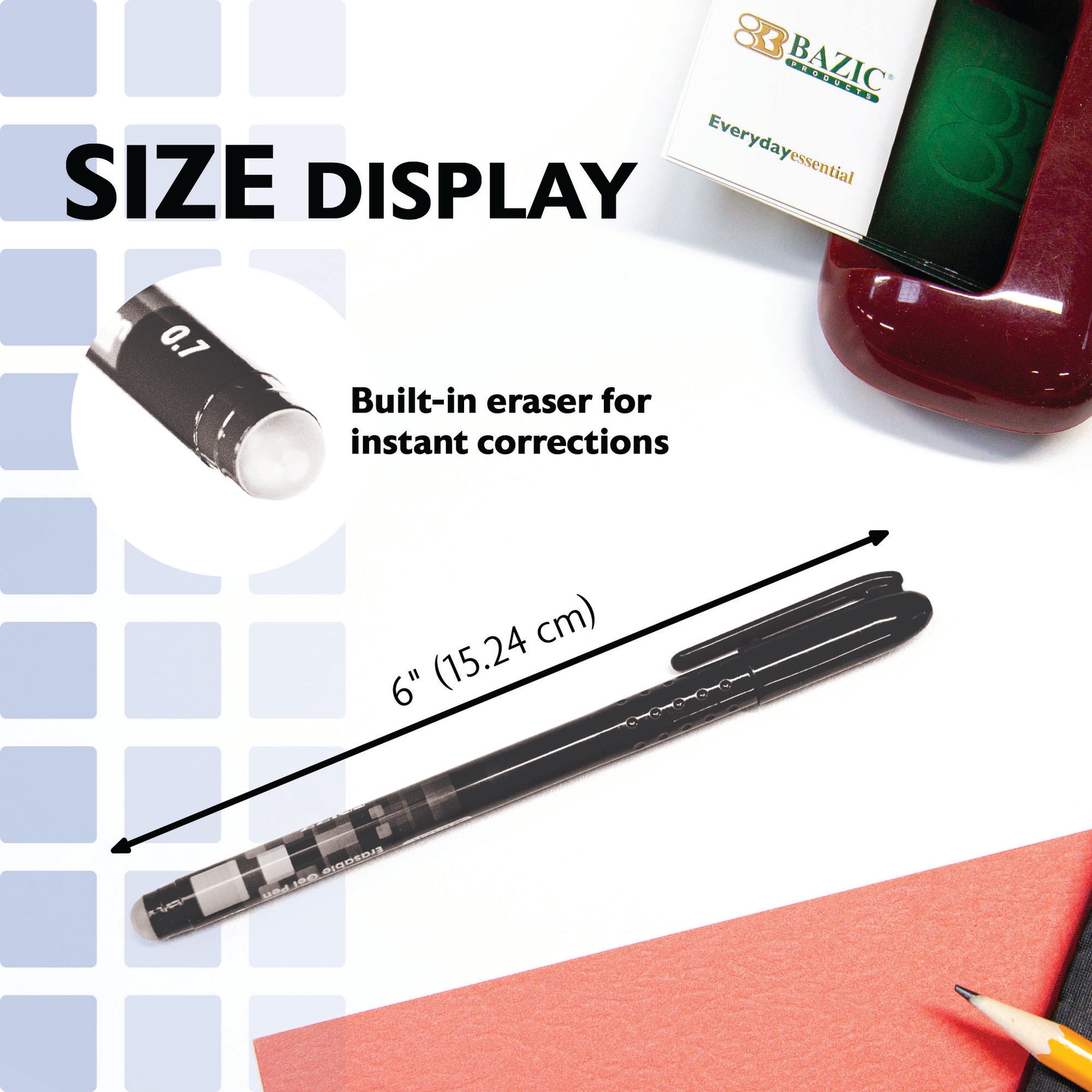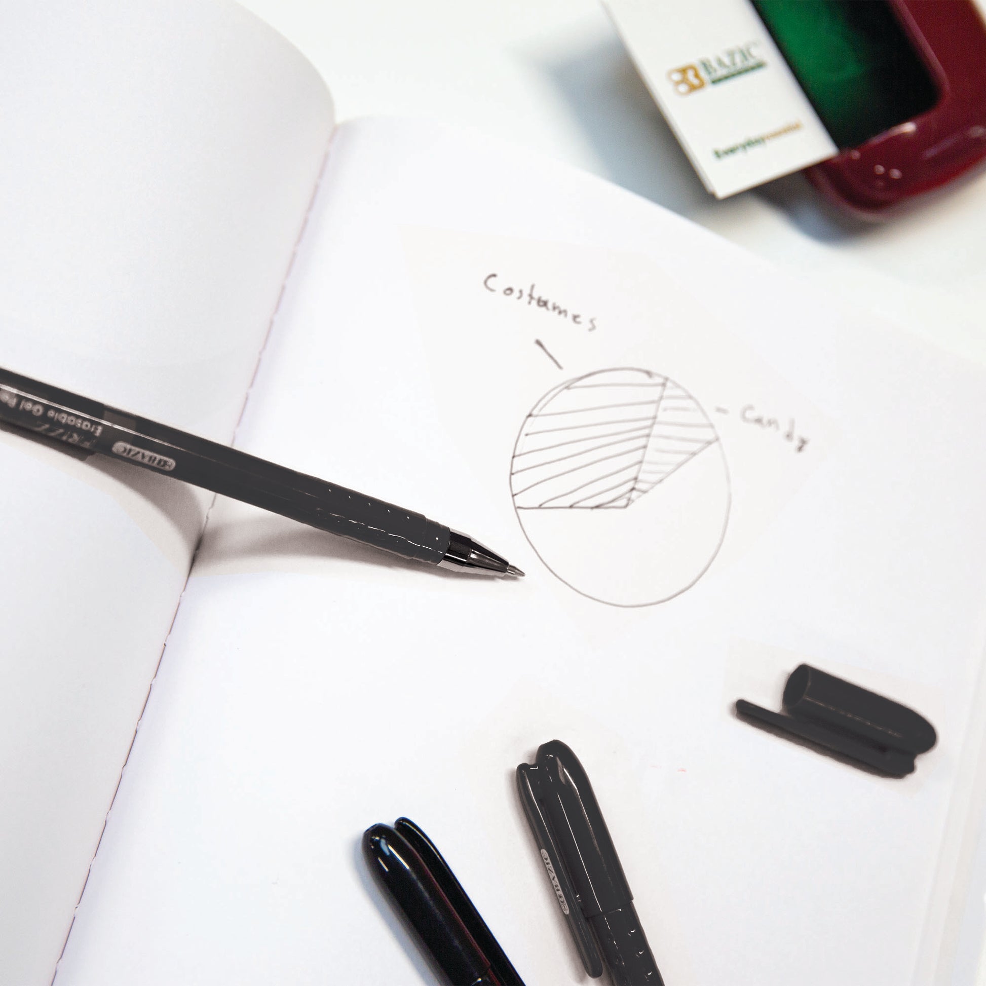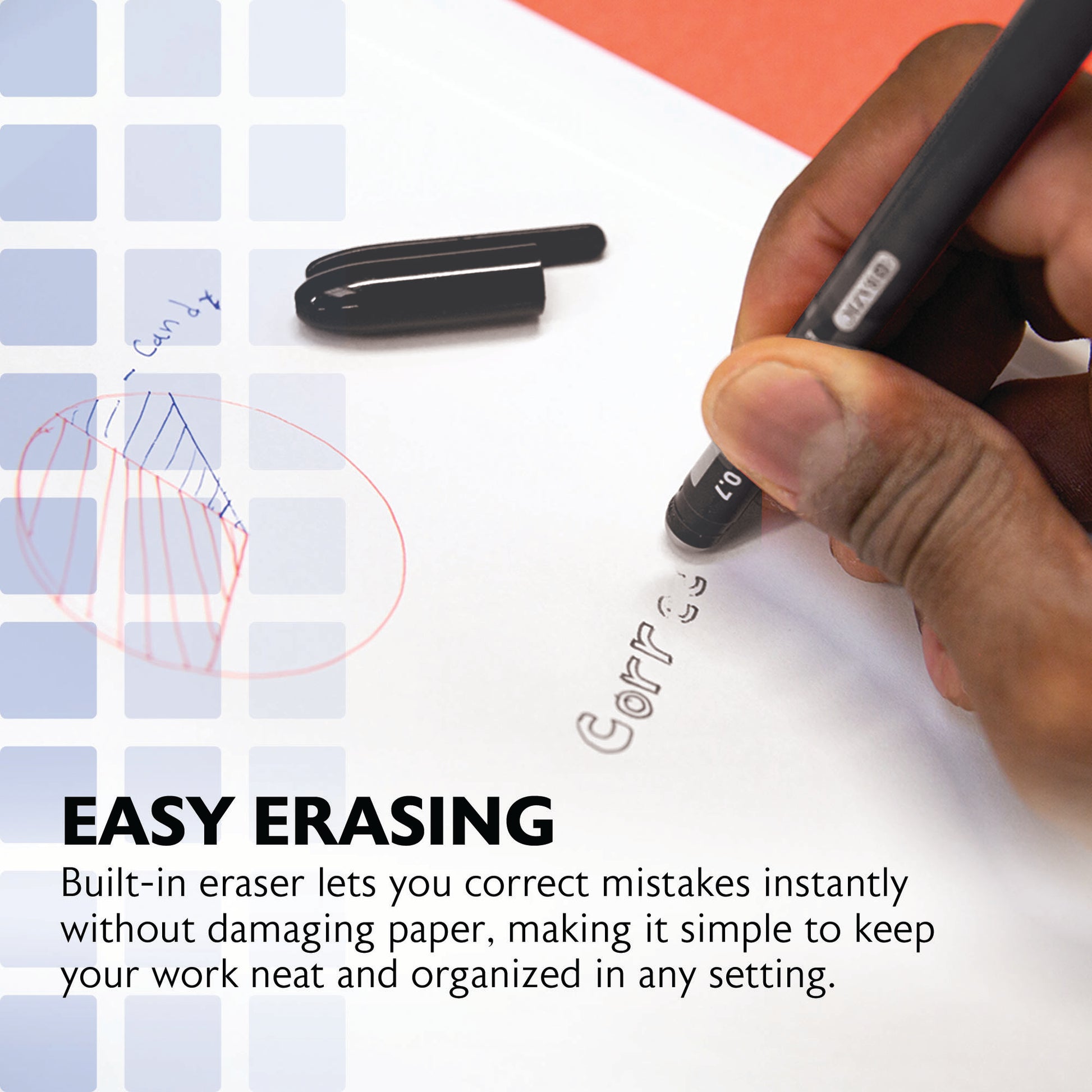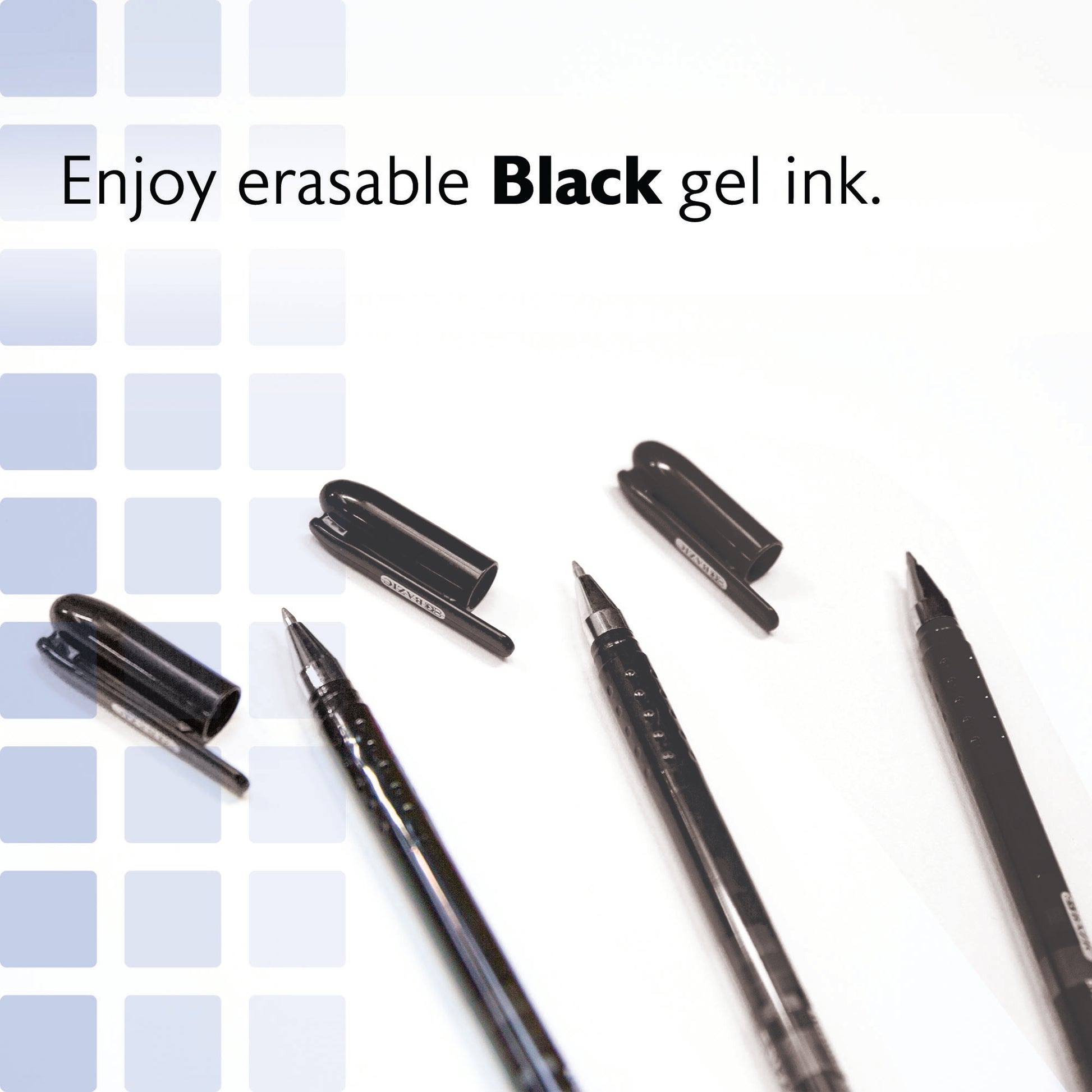 ERASABLE GEL INK. Enjoy erasable black gel ink with built-in erasers for instant corrections. Write smoothly and erase cleanly so notes stay flawless, while ink becomes permanent over time for lasting results.