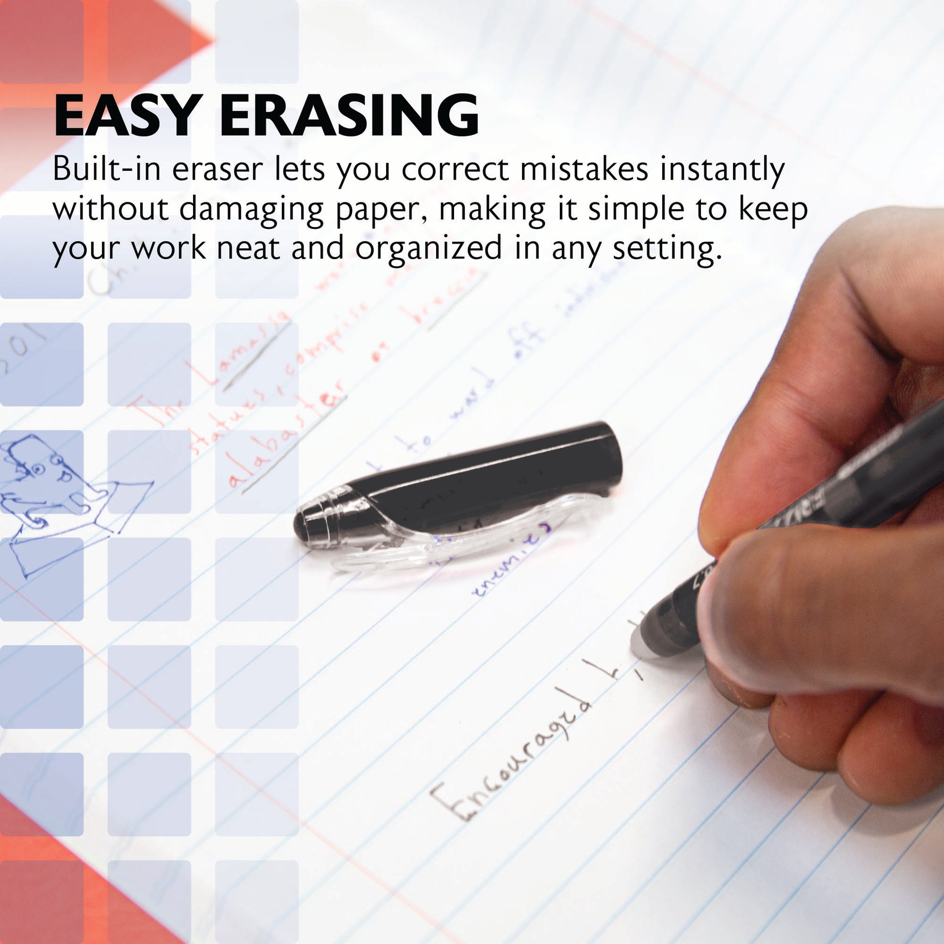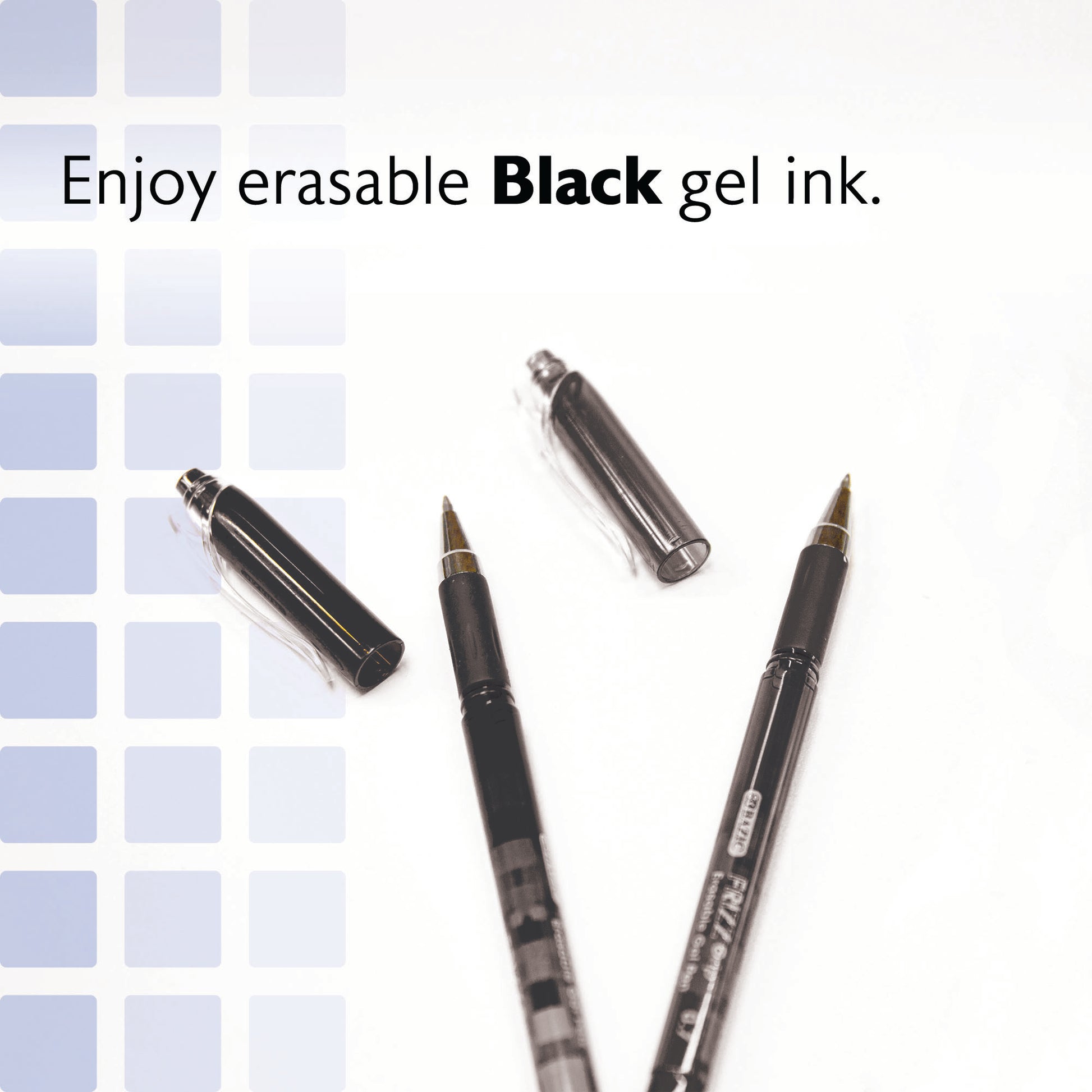 ERASABLE GEL INK. Enjoy erasable black gel ink with a built-in eraser for instant corrections. Write smoothly and erase cleanly so notes stay flawless, while ink becomes permanent over time for lasting results.