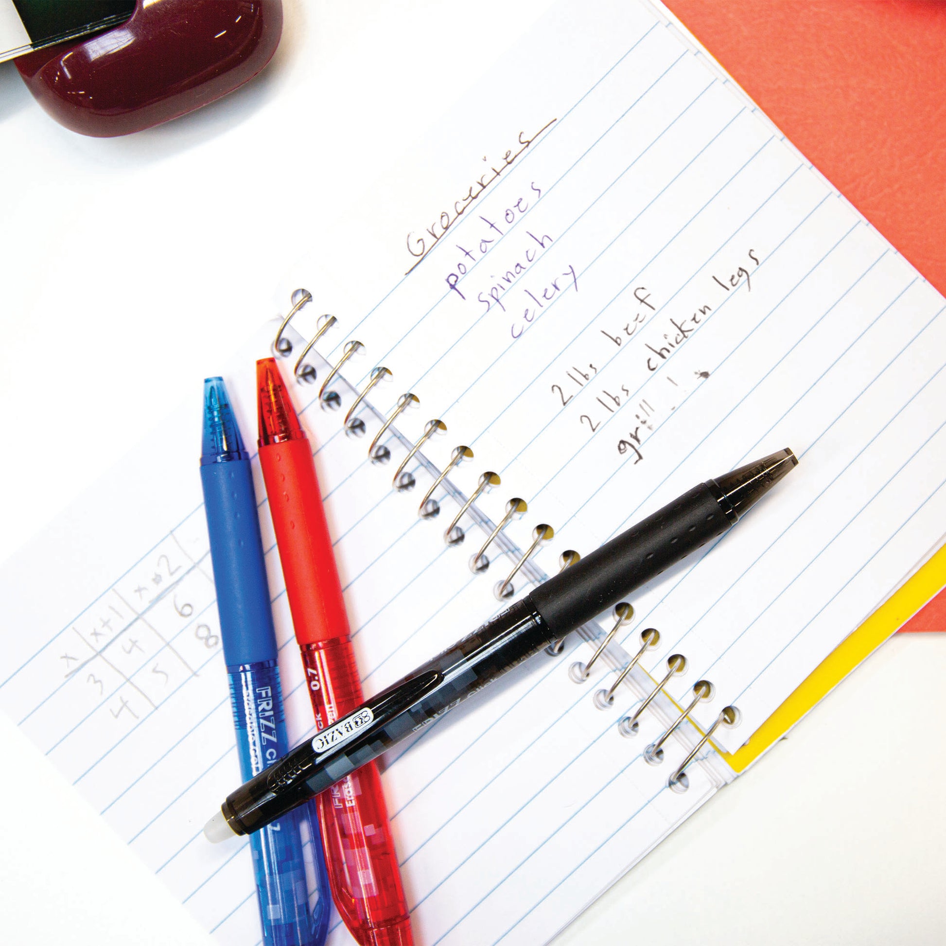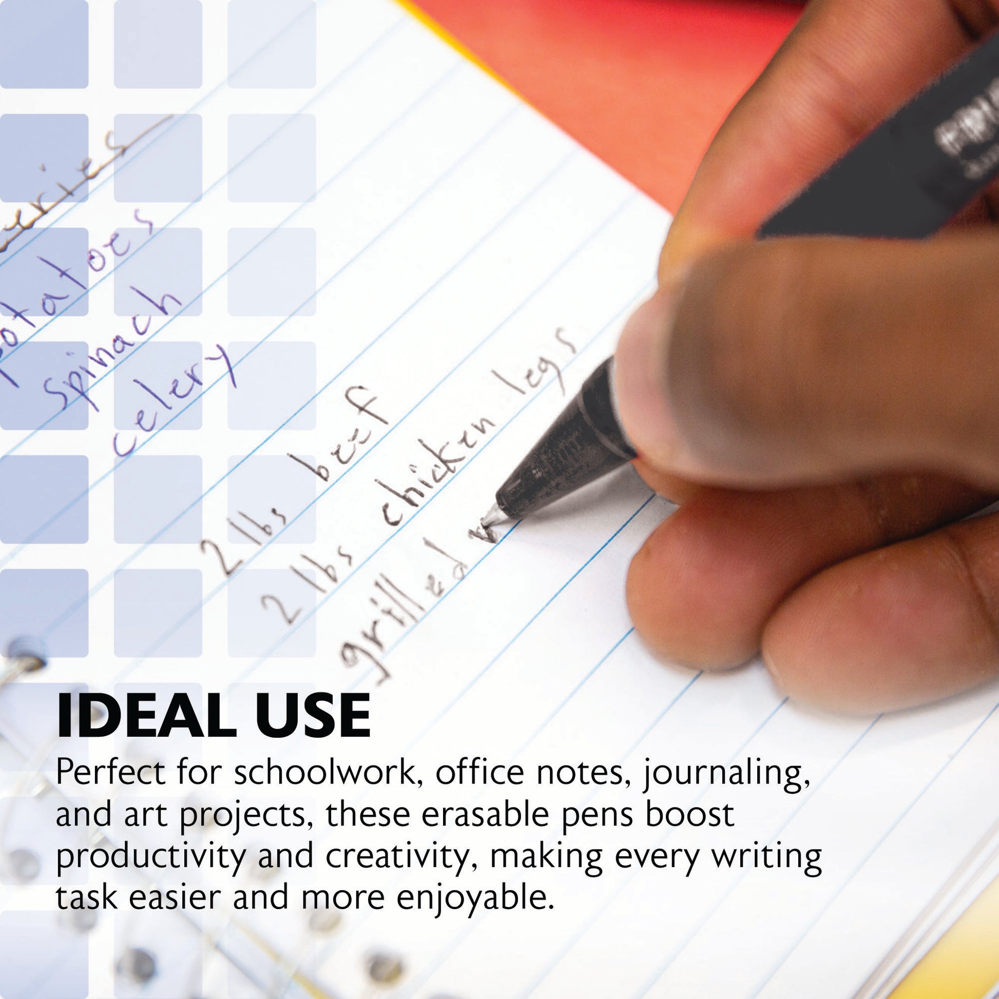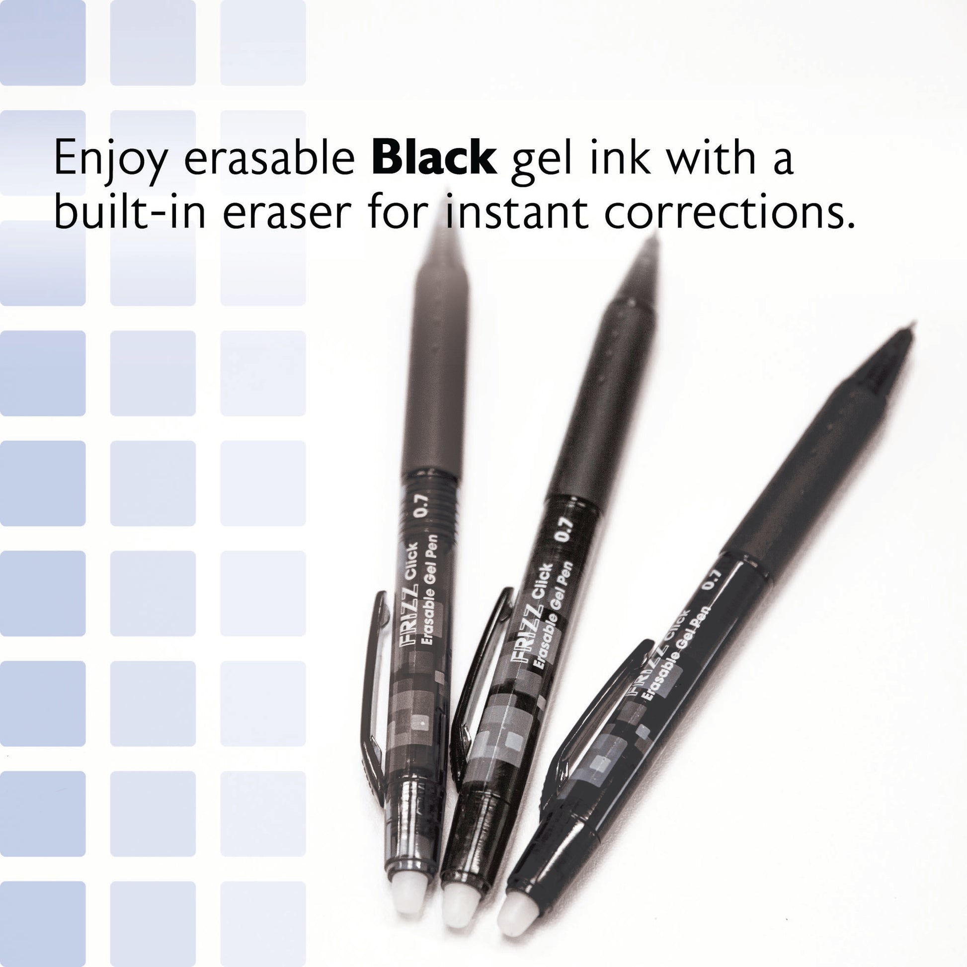 ERASABLE GEL INK. Enjoy erasable black gel ink with a built-in eraser for instant corrections. Write smoothly and erase cleanly so notes stay flawless, while ink becomes permanent over time for lasting results.