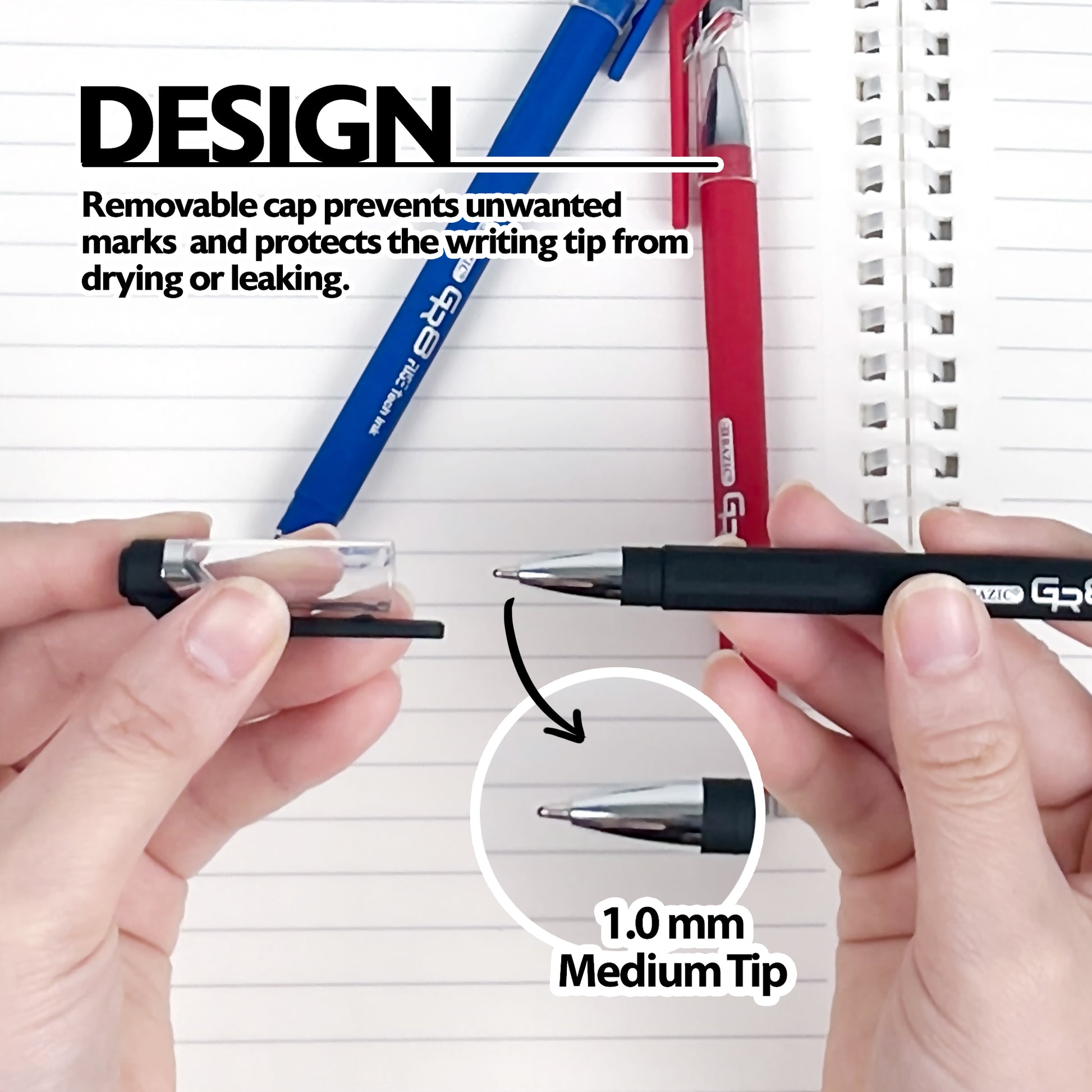 - DESIGN. Each pen features rubberized barrel making it very comfortable for users. Removable cap prevents unwanted marks and protects the writing tip from drying or leaking.