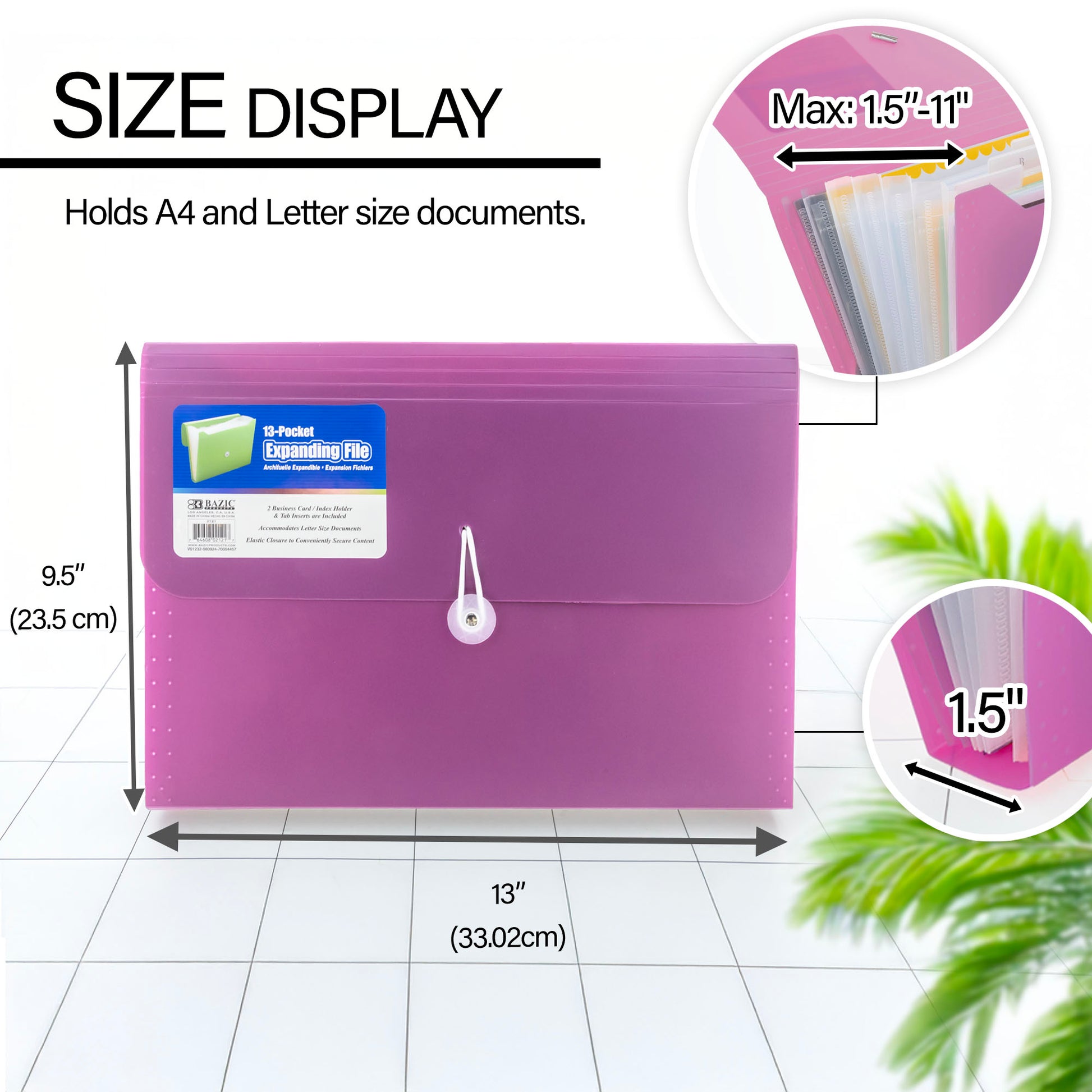- FILE ORGANIZER. Made from high quality Polypropylene (PP) Plastic material. Safe & Non Toxic. Measure: 13" x 9.5" x 1.8". Expandable with 13 pockets and 2 card slots. Fits both A4 and letter size