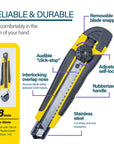 - RELIABLE & DURABLE. Retractable snap-off utility knife is sturdy and strong as it has stainless steel blades of high quality and ergonomic handle. Cut sharp and rust resistance. Grade heavy duty use.