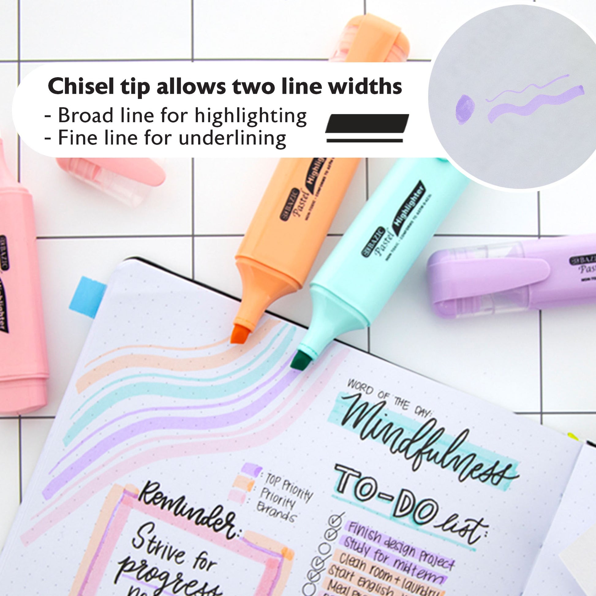 - VERSATILE CHISEL TIP. Pastel highlighter has a molded narrow chisel tip which allows two line widths. Broad-line for highlighting and Fine-line for underlining details with just a twist of the wrist.