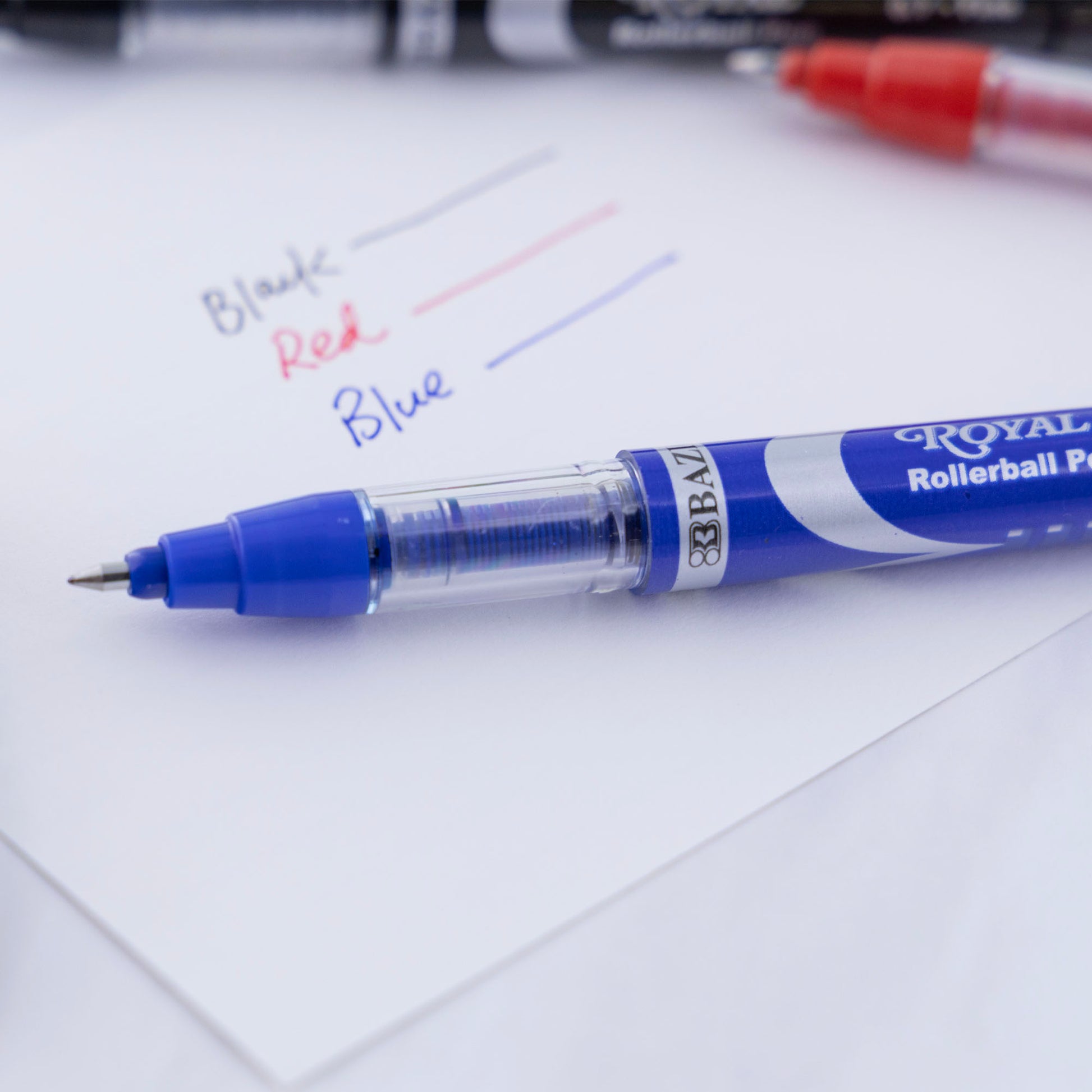 - ROYAL ASSORTED COLOR ROLLERBALL PEN. Each pack includes 3-Assorted Rollerball Pens; Red, Black and Blue. These fine point pens flow free and write more smoothly than traditional pens.