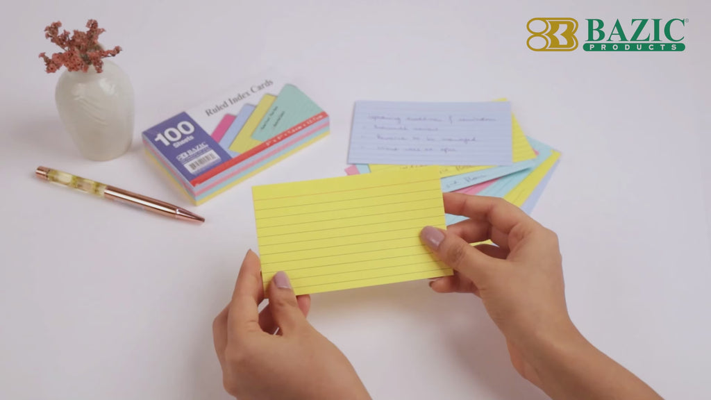 - PACKAGE INCLUDES. Ruled index cards come in an assortment of colors with 100sheets in total per pack. Index cards have a ruled front and plain back.Size: 3"x5"inch- 7.6cm x 12.7cm