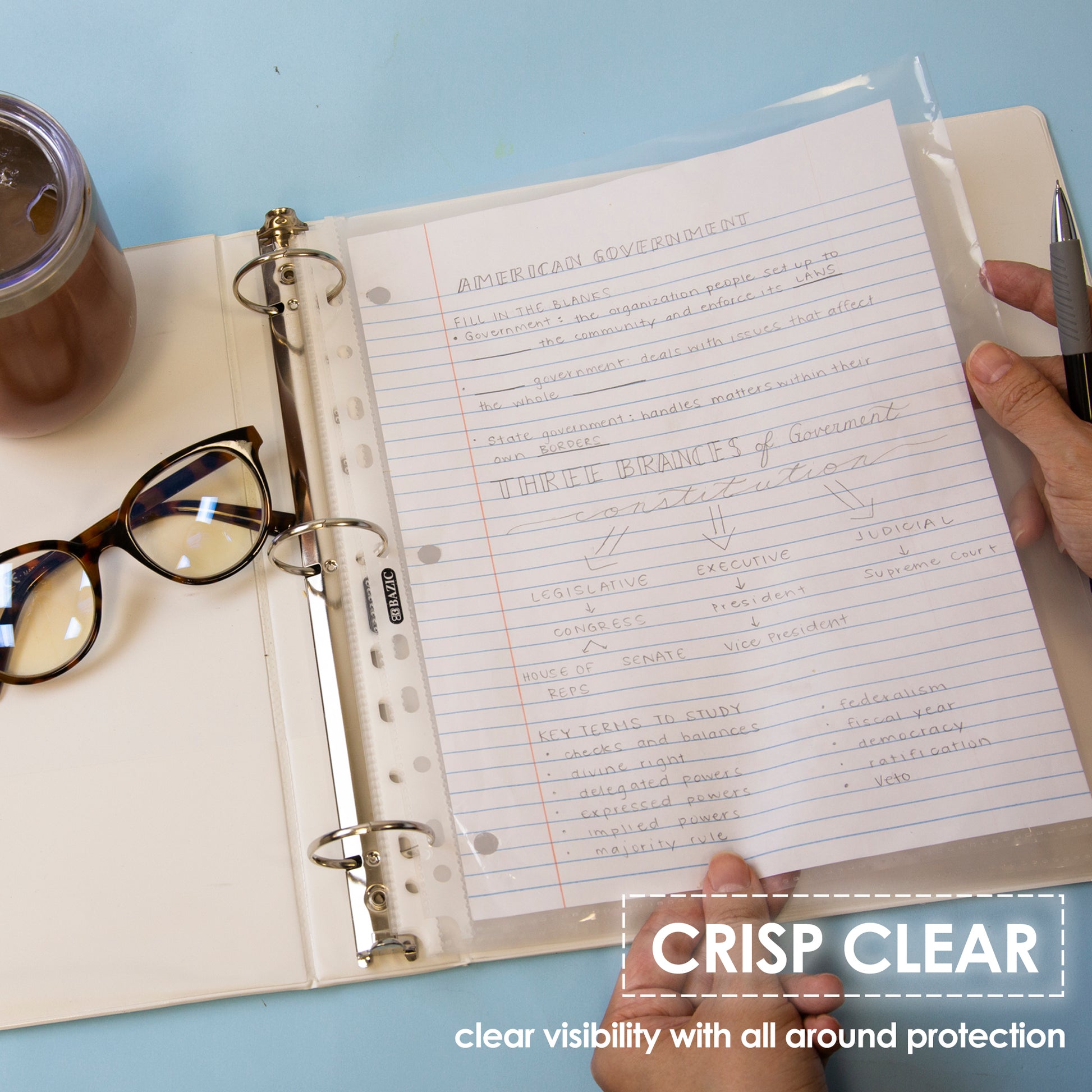 - MULTI USE. Consists of 11 pre-punched holes which fits into various types of ring binders. Non-stick and clear poly sheet protectors protects portfolio, projects, receipt, class work, or any business need.