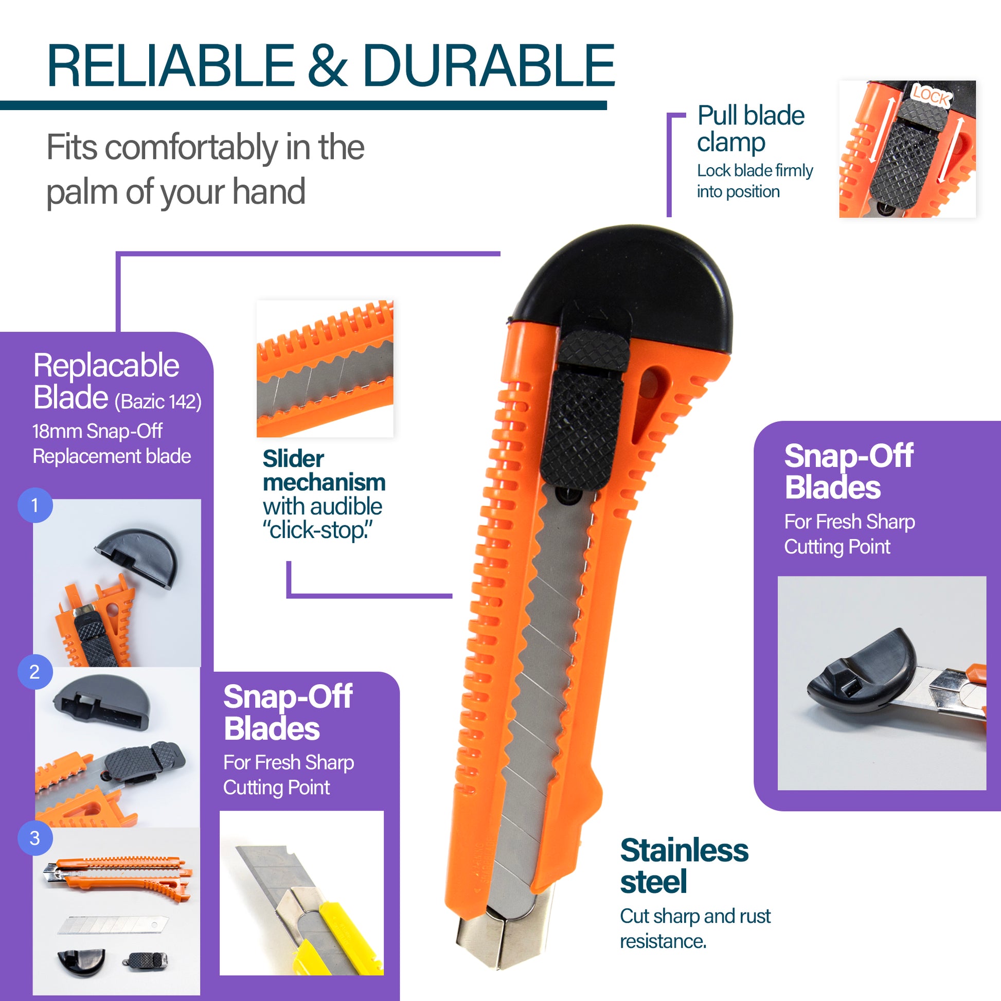 - RELIABLE & DURABLE. Retractable snap-off utility knife is sturdy and strong as it has stainless steel blades of high quality and ergonomic handle. Cut sharp and rust resistance.