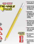 - THE FIRST TRI-ANGLE PENCIL JUMBO W/ ERASER. Each pack comes with 3 triangular jumbo pre-sharpened pencils; 1 sharpener included. The diameter of the lead is 3.25mm thick.
